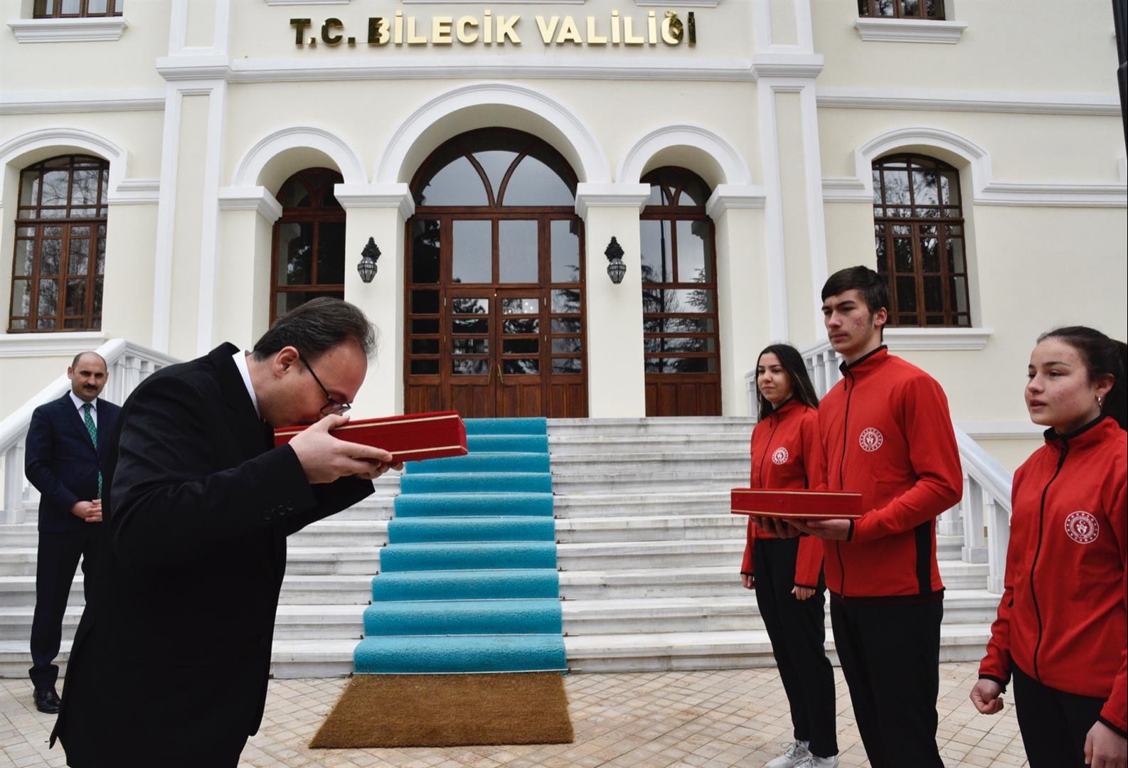 Bilecik Valisi Kemal Kızılkaya’na sunulan emanetler, törenin ardından Bilecikli atletler tarafından Eskişehirli gençlere teslim edilmek üzere taşınmaya başlandı.