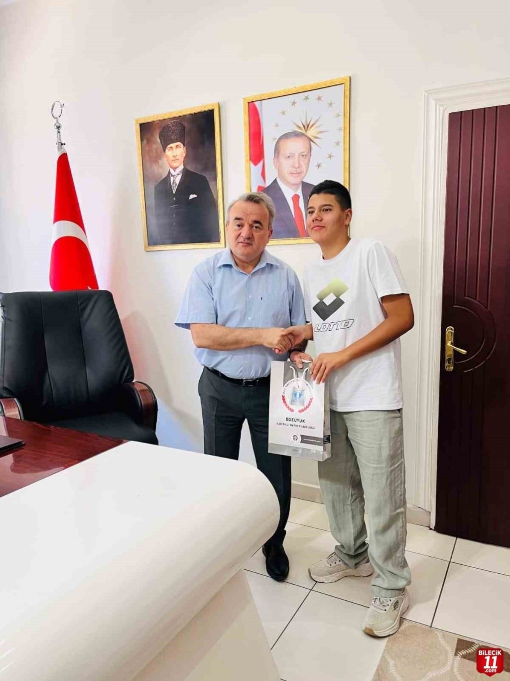 Bilecik’in Bozüyük ilçesinde LGS (Lise Giriş Sınavında) sadece bir boş soru ile il ve ilçe birincisi olan Bozüyük Mehmet Akif Ersoy Ortaokulu öğrencisi Ahmet Eymen Koç, İlçe Kaymakamı Adem Öztürk’ü makamında ziyaret etti.