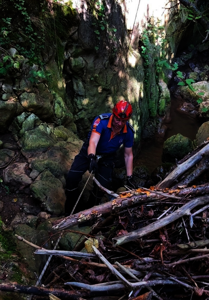 Merkeze bağlı Bahçecik köyünde dere yatağında bir köpeğin mahsur kaldığı ihbarını alan AFAD ekipleri, 15 metrelik yükseklikten mağaraya indi.