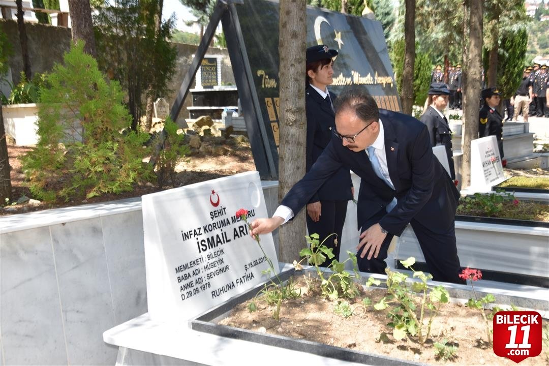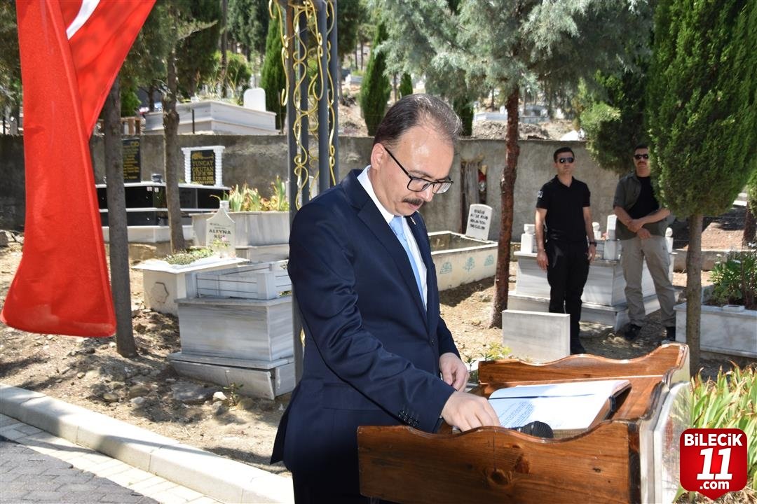 Merkez Şehir Mezarlığında ki şehit kabirlerinin ziyaret edilmesi ile başlayan tören; saygı duruşunun akabinde; tören mangasının saygı atışı, şehit kabirlerine karanfil bırakılması ile devam etti.