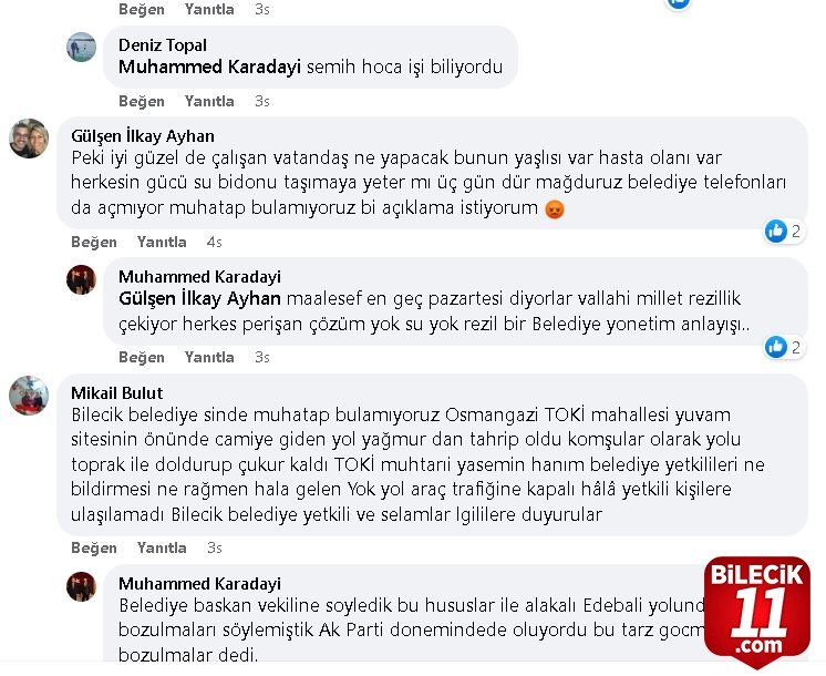 “Bilecik belediye sinde muhatap bulamıyoruz” diyen bir vatandaş isyanını şu sözler ile dile getirdi: “ Osmangazi TOKİ mahallesi yuvam sitesinin önünde camiye giden yol yağmur dan tahrip oldu komşular olarak yolu toprak ile doldurup çukur kaldı TOKİ muhtarı yasemin hanım belediye yetkilileri ne bildirmesi ne rağmen hala gelen yok yol araç trafiğine kapalı hâlâ yetkili kişilere ulaşılamadı Bilecik belediye yetkili ve selamlar ilgililere duyurulur”