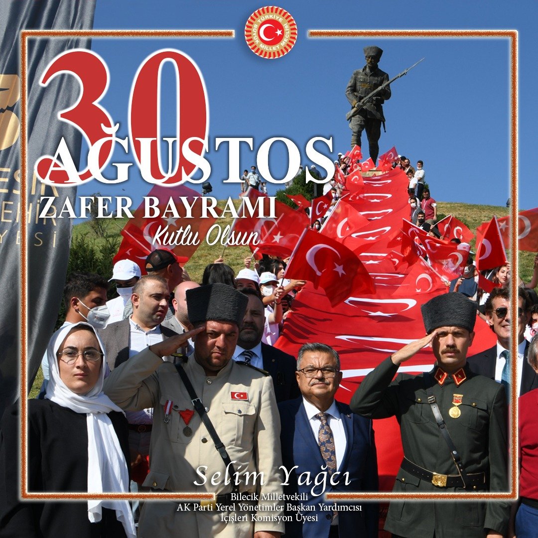 ”Mustafa Kemal Paşa’nın “Siz orada yalnız düşmanı değil milletin makûs talihini de yendiniz“ sözleriyle önemini vurguladığı TBMM ordularımız zaferlerinin ilk halkasına ev sahipliği yapan Diriliş, Kuruluş ve Kurtuluşun şehri Bilecik Milletvekili olarak, zaferler silsilemizin son halkası olan, ’30 AĞUSTOS ZAFER BAYRAMI’nın 100. yıldönümünü ve Yüce milletimizin bağrından çıkardığı, Türk Silahlı Kuvvetlerimizin gurur gününü milletçe hep birlikte kutluyoruz.
