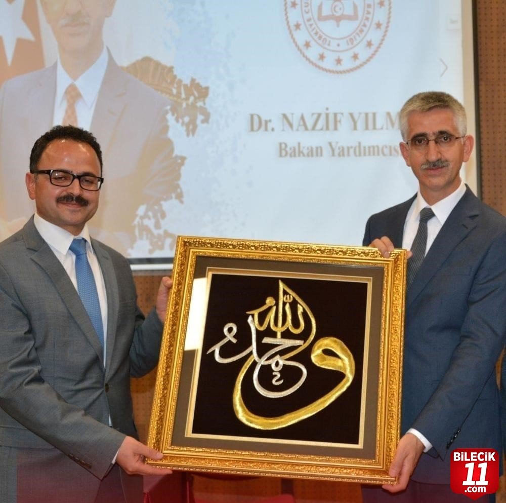 Bakan yardımcısı Dr. Yılmaz, ziyaretler çerçevesinde Mehmetçik Ortaokulunda yöneticilerle gerçekleştirilen 2023-2024 eğitim öğretim yılı hazırlık ve değerlendirme toplantısına katıldı. Toplantı sonunda Kütahya İl Milli Eğitim Müdürü Hasan Başyiğit ve Kaymakam Hakan Alkan, Bakan Yardımcısı Dr. Nazif Yılmaz’a hediye takdiminde bulundu.