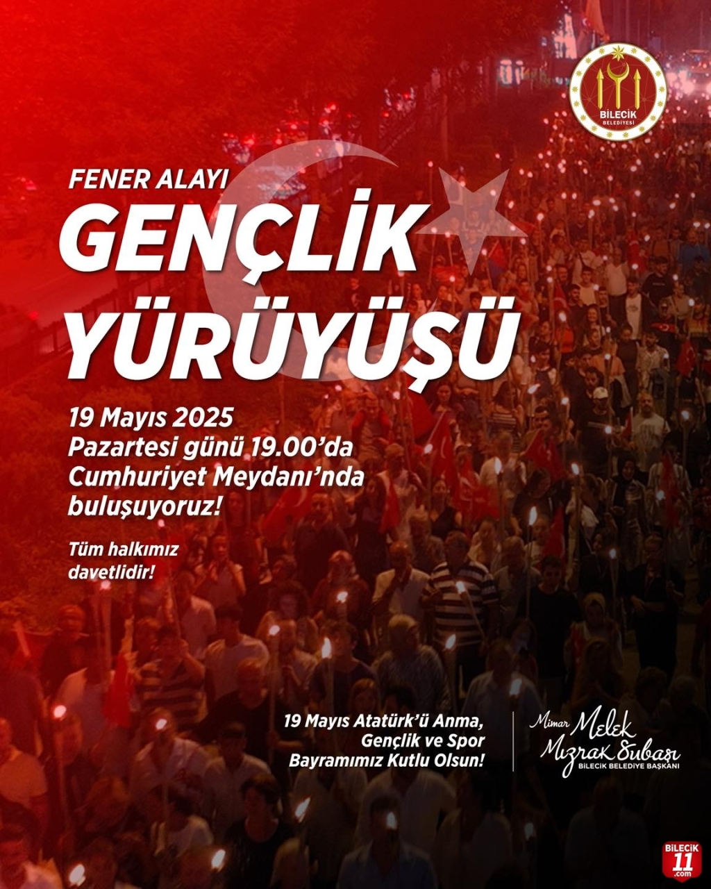 19 Mayıs Atatürk’ü Anma, Gençlik ve Spor Bayramımızda, bağımsızlık meşalesini hep birlikte taşıyacağımız Fener Alayı’na tüm vatandaşlarımız davetlidir.” sözlerine yer verdildi.
