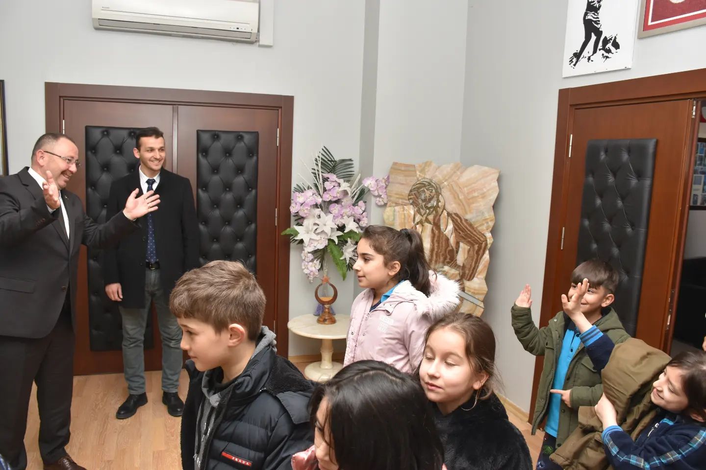 Salih ve Ömer Musaoğlu ilköğretim okulu 3. sınıf öğrencilerini Belediye binası önünde karşılayan Başkan Sever, miniklere yakın ilgi gösterdi.