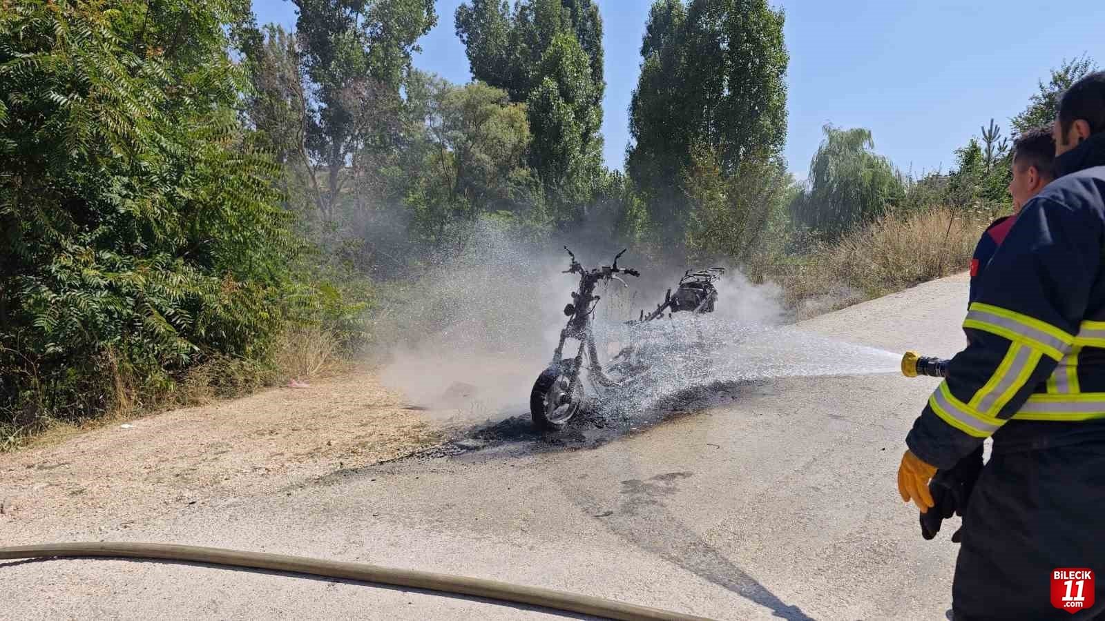 Alınan bilgilere göre; Bilecik kent merkezinden Çakırpınar Köyü yolunda seyir halindeki sürücüsü öğrenilemeyen 16 ECC 35 plakalı motosiklet Kaldırak Köprüsü’ne gelmeden alev almaya başladı. Alevler yolun sağ tarafındaki otluk alana sıçradı. Bu alan tutuşurken, Bilecik Belediyesine bağlı itfaiye ekipleri yangını zamanında müdahale ederek alevleri büyümeden söndürdü. – İHA