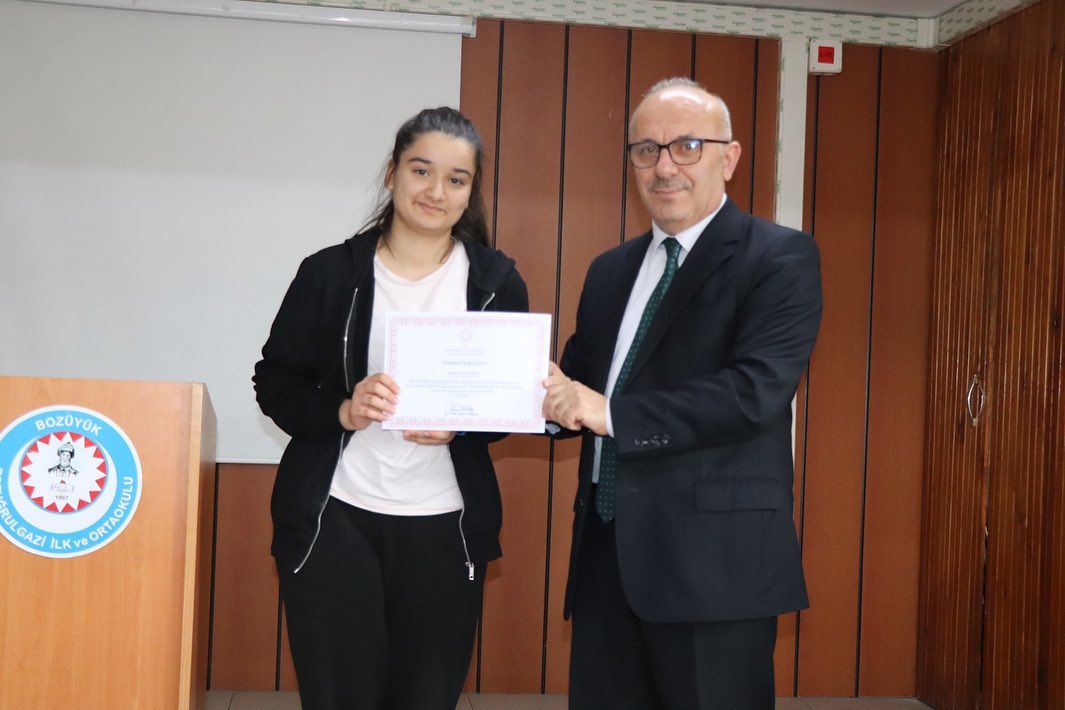 Öğretmen ve öğrencilerin başarılarını kutlayıp ve Teşekkür Belgelerini takdim eden Müdür Demir, okulda bir yanlış ile ilçe birincisi olan Ekin Naz Aydın'ı da Teşekkür Belgesi ile ödüllendirdi. Öğrencilere hitap ederek başarılarını kutladı ve yapılacak LGS Sınavı için de başarılar diledi.