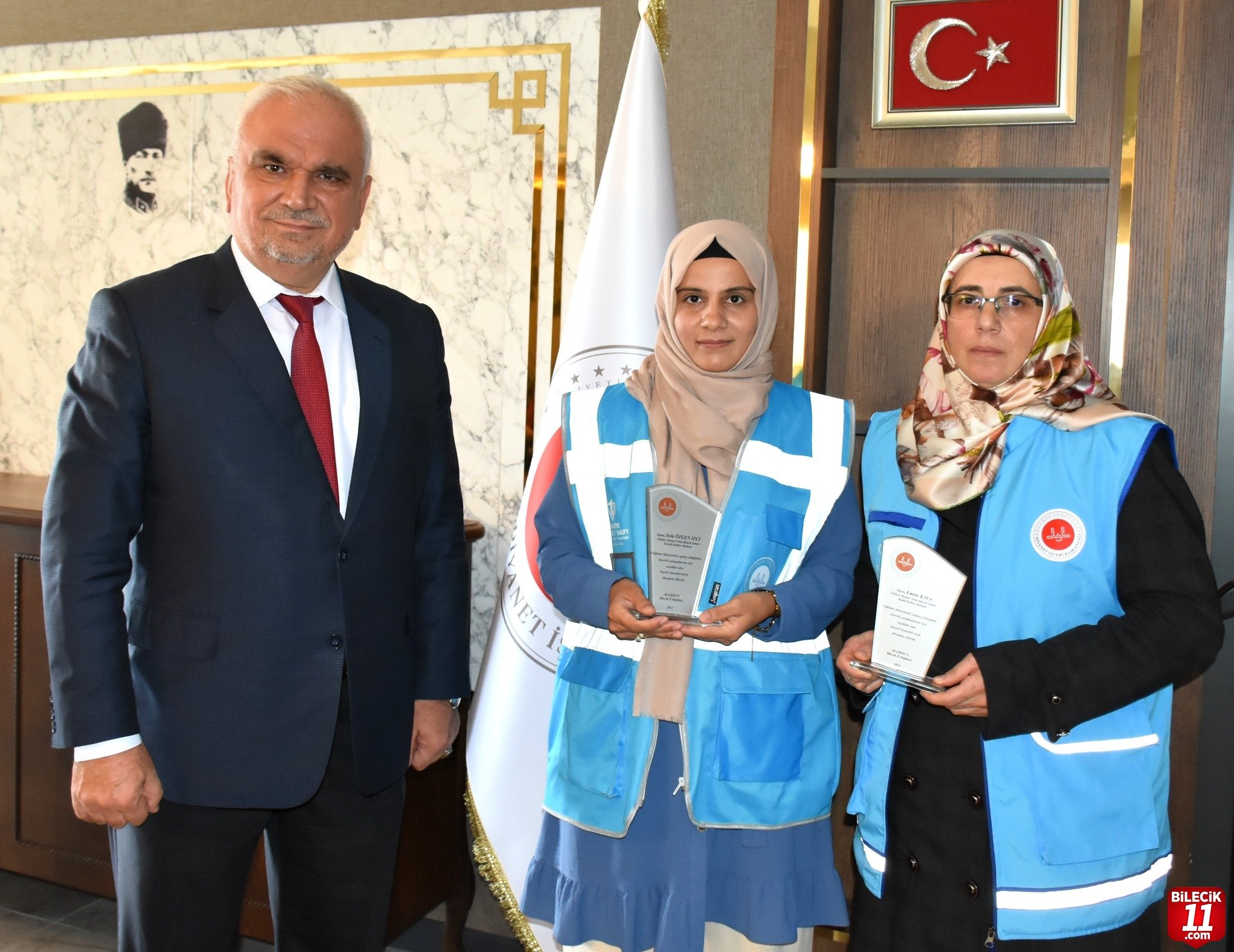 Bilecik İl Müftüsü Ali Erhun, Türkiye Diyanet Vakfı (TDV) Bilecik Şubesi Kadın Kolları Başkanı Emine Kaya ve Gençlik Kolları Başkanı Seda Özgen İzci’ye, vakıf bünyesinde gönüllü olarak yaptıkları faaliyetler nedeniyle teşekkür ederek plaket takdim etti.