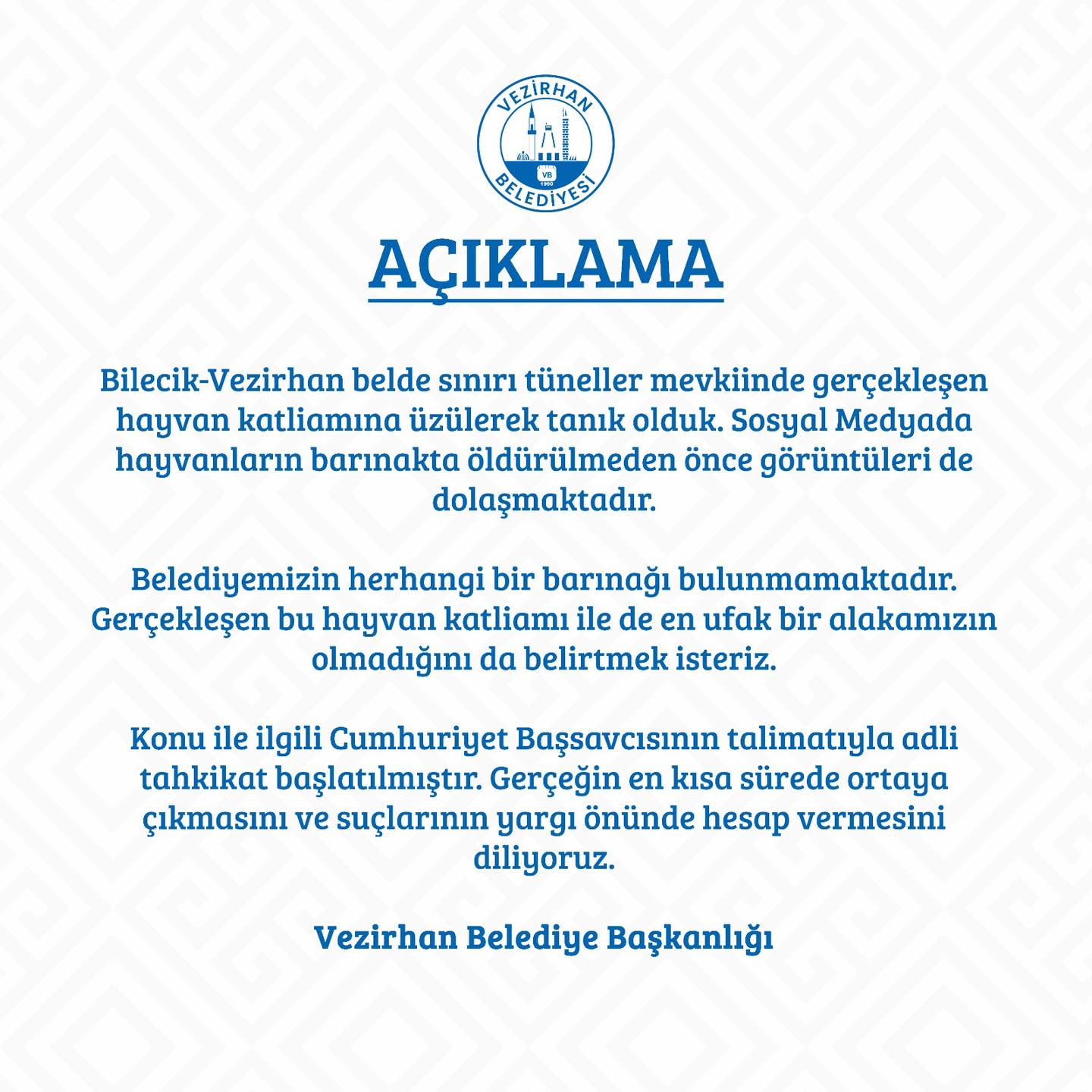 Vezirhan Belediyesi’nden yapılan açıklamada:“Bilecik-Vezirhan Belde sınırı, tüneller mevkiinde gerçekleşen hayvan katliamına üzülerek tanık olduk. Sosyal medyada hayvanların barınakta öldürülmeden önce görüntüleri de dolaşmaktadır. Belediyemizin herhangi bir barınağı bulunmamaktadır.