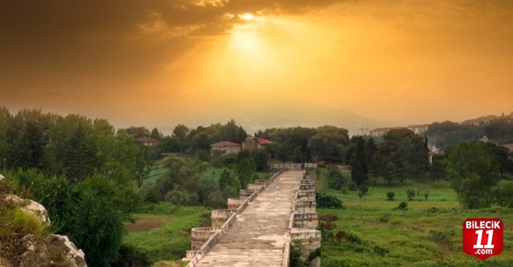 Sapanca Gölü’nün sularını Sakarya Nehri’ne taşıyan Çark Deresi üzerinde konumlanan Justinianus Köprüsü, Bizans Dönemi’ne ait olan anıtsal nitelikteki yapılardan biridir. Bizans İmparatoru Justinianus M.S. 558-560 senelerin inşa ettirilmiş olup Erken Bizans Dönemi’nin günümüze dek ulaşan sağlam kalabilmiş eserlerindendir. 365 metre uzunluğunda ve 9,85 metre genişliğine sahip olan köprünün orta kısımlarında dairesel 7, 2 batı, 3 doğu yönünde bulunan kemer mevcut. 1995 senesinde Karayolları Genel Müdürlüğü tarafından restore edilen köprü araç trafiğine kapalı durumdadır.