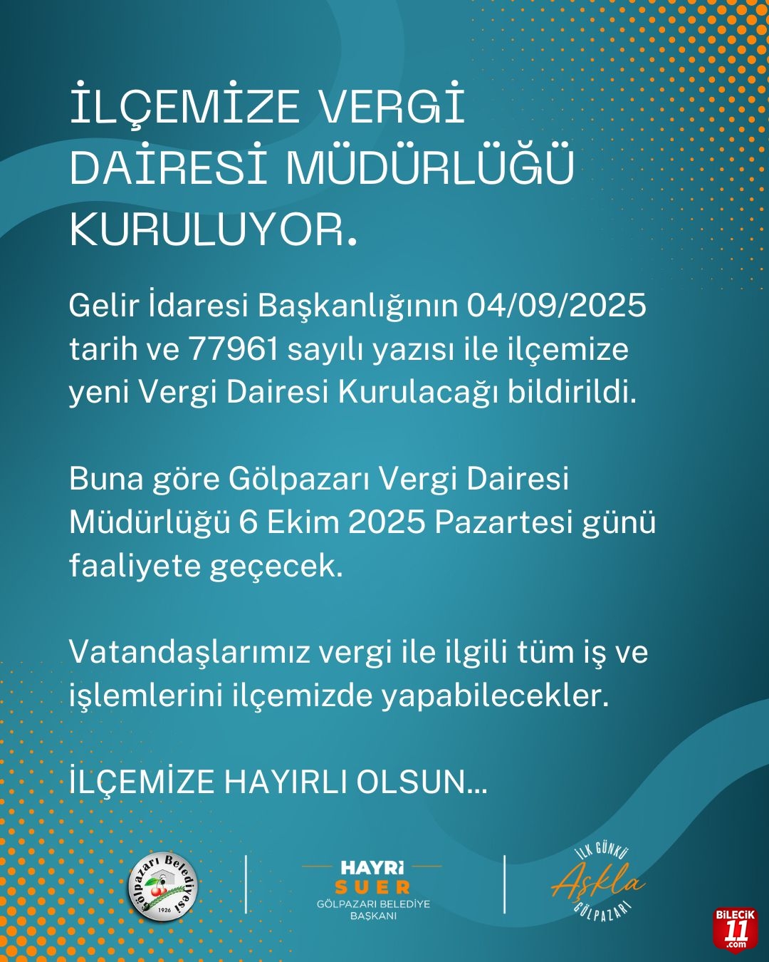 “Gelir İdaresi Başkanlığının 04/09/2025 tarih ve 77961 sayılı yazısı ile ilçemize yeni Vergi Dairesi Kurulacağı bildirildi. Buna göre Gölpazarı Vergi Dairesi Müdürlüğü 6 Ekim 2025 Pazartesi günü faaliyete geçecek.Vatandaşlarımız vergi ile ilgili tüm iş ve işlemlerini ilçemizde yapabilecekler.”