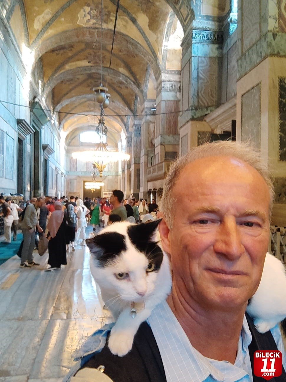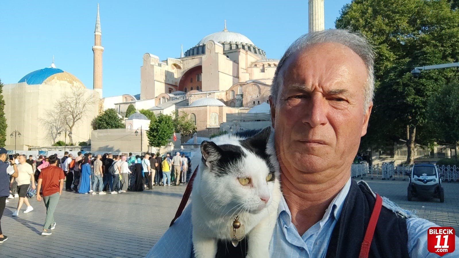 Omzunda kedisi Slyvia’yı gezdiren Eskişehirli Mustafa Rahmi Erçetin, İstanbul’un tarihi mekân ve sokaklarını evcil hayvanı ile gezerken turistlerin ilgi odağı oldu.
