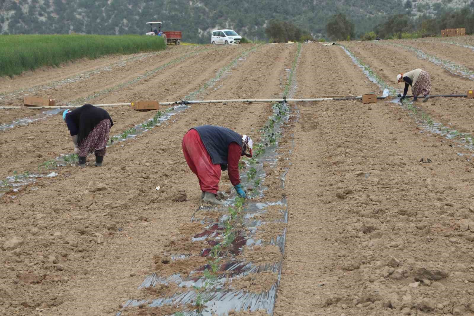 Yüksek verim almak isteyen üreticiler, toprağa ekilen fidelerin zirai dondan etkilenmemesi için üzerlerine naylon sererek önlem alıyor.