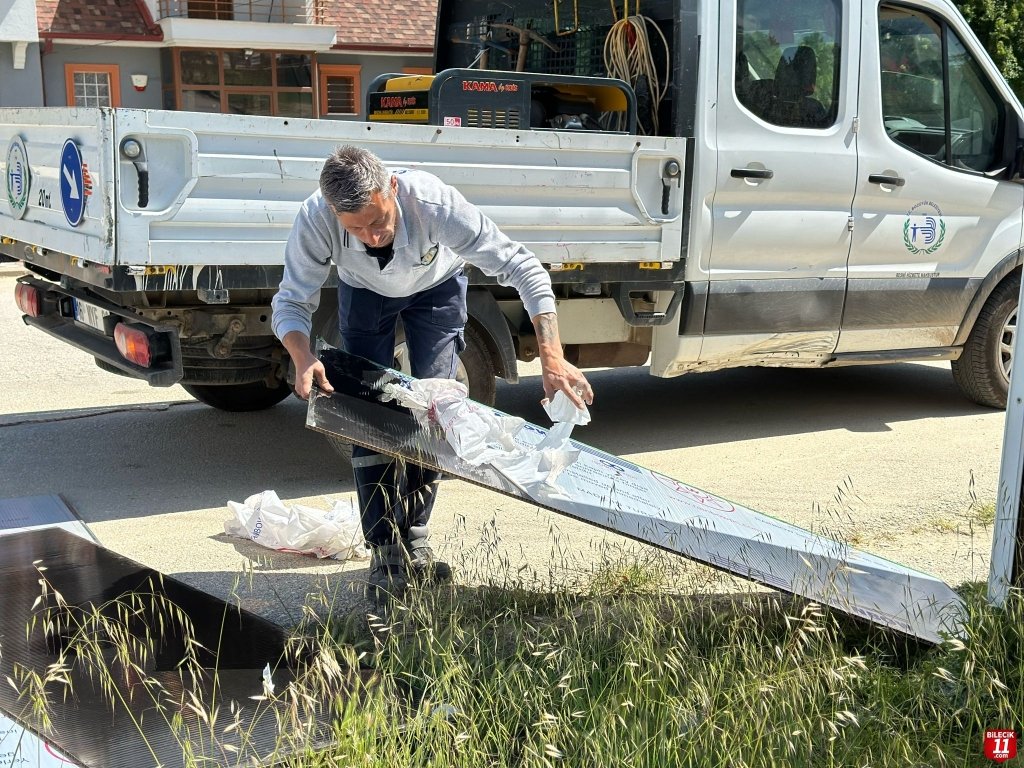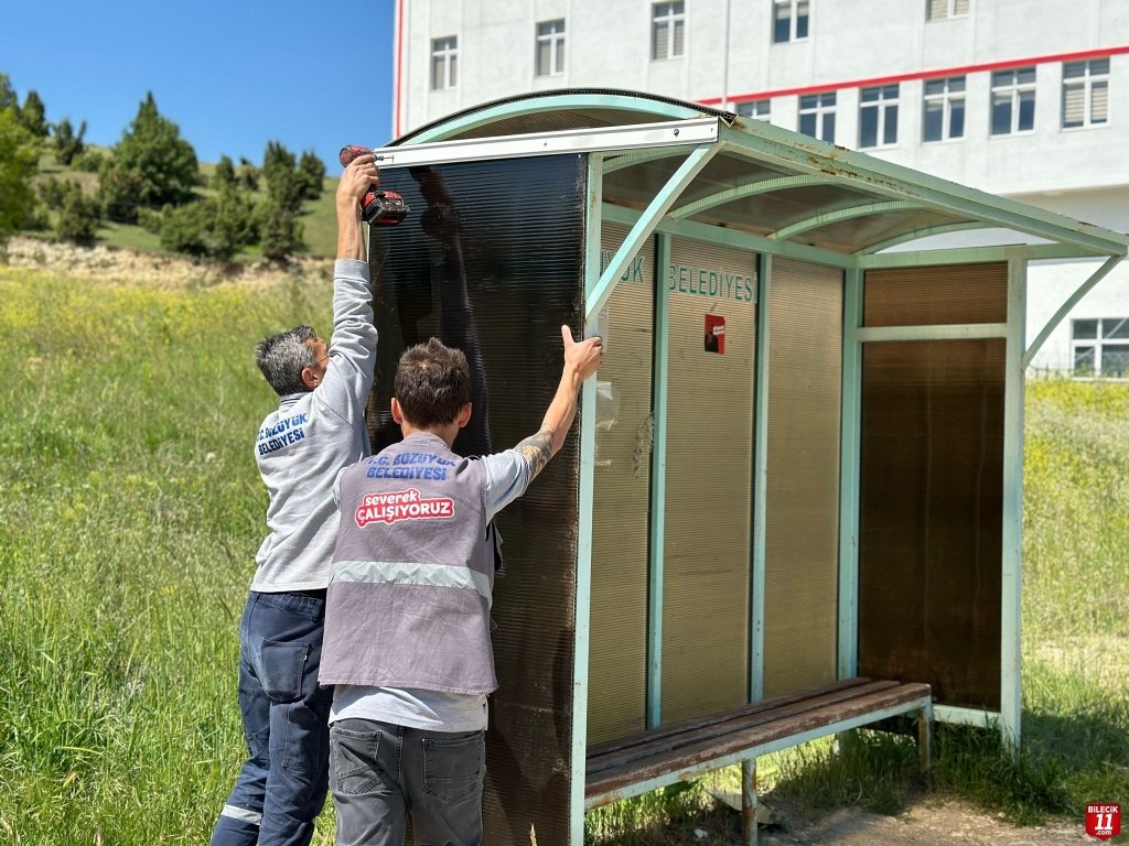 Bozüyük Belediyesi ekipleri tarafından ilçe genelinde hizmet veren otobüs ve dolmuş duraklarının tamir çalışmaları kapsamında Yeşil kent Mahallesi’nde bulunan durakların kırılıp dökülen polikarbon bölümleri yenileriyle değiştiriliyor.
