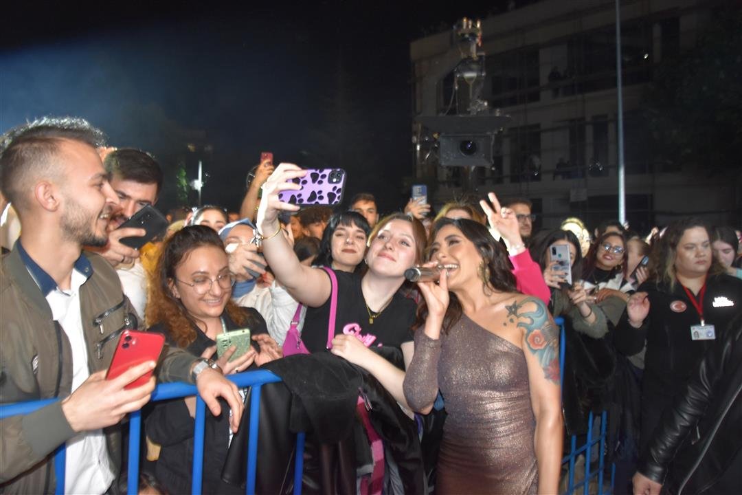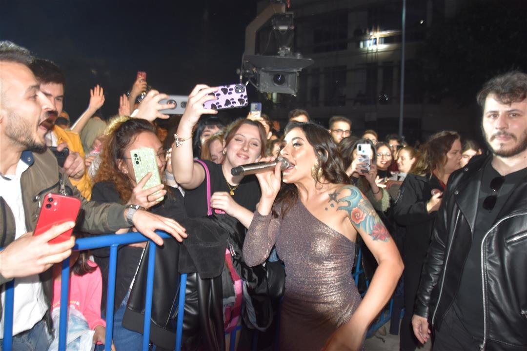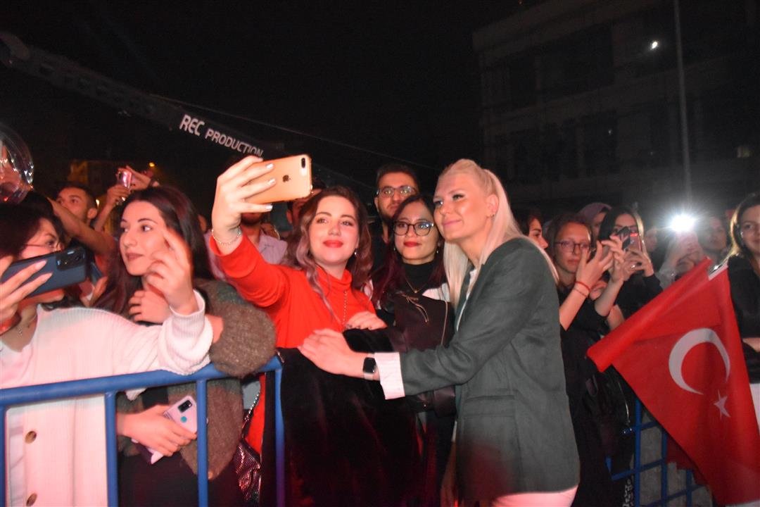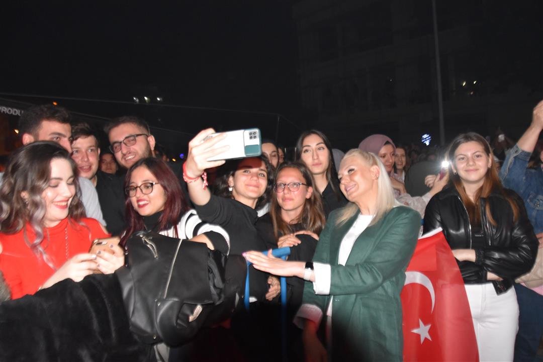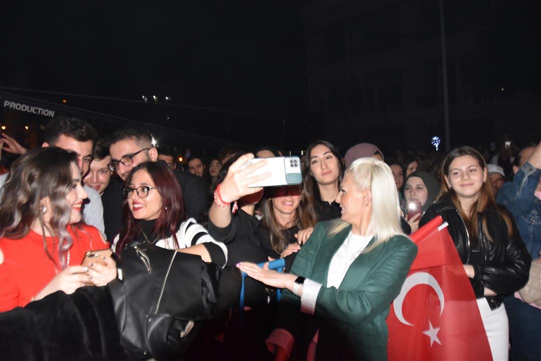 Cumhuriyet Meydanını dolduran vatandaşları seslendiği şarkılar ile kah neşelendiren kah duygulandıran Sanatçı Melek Mosso konserin ilerleyen saatlerinde sahneden inerek vatandaşlar ile birlikte şarkı söyledi.