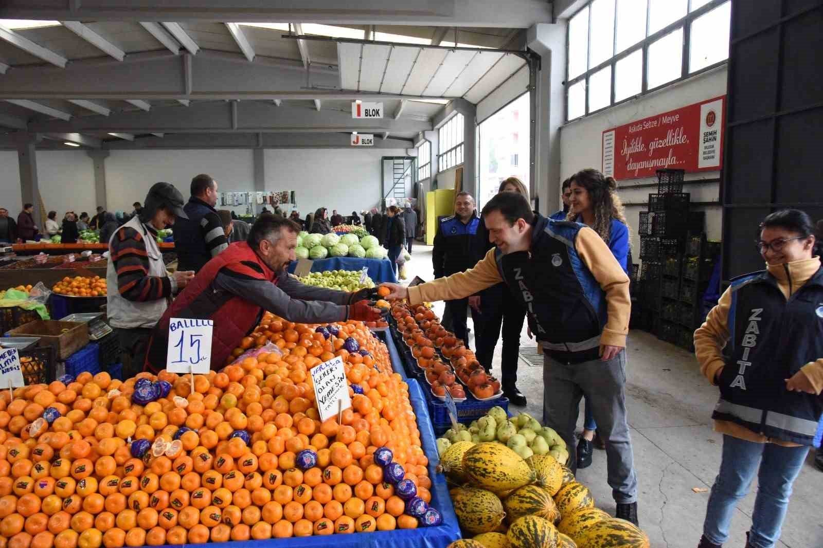 Kapalı Pazar alanında denetim yapan özel gereksinimli bireylere pazar esnafı da yoğun sevgi gösterisinde bulunarak meyve ikram etti.