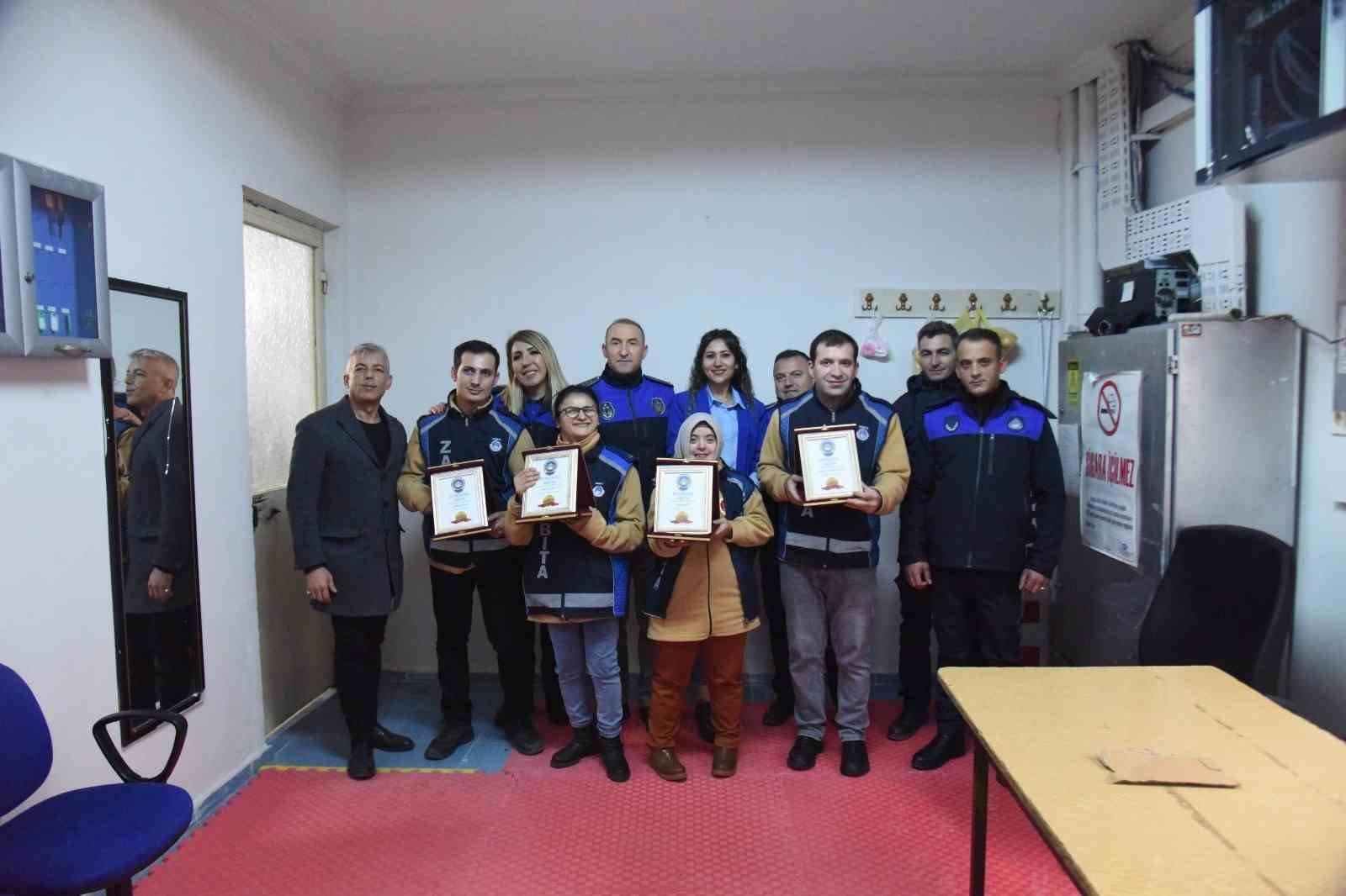 Denetim etkinliği, Zabıta Müdürü Öndersev ve zabıta memurlarının özel gereksinimli çocuklara başarı belgesi verip fotoğraf çektirmesiyle sona erdi. – İHA