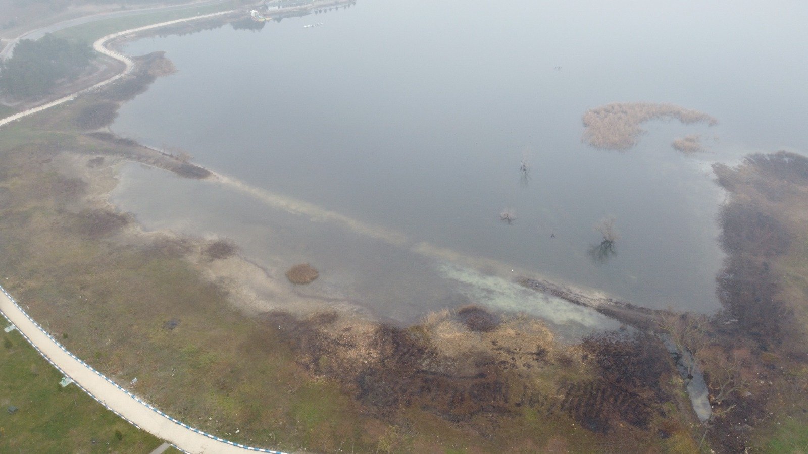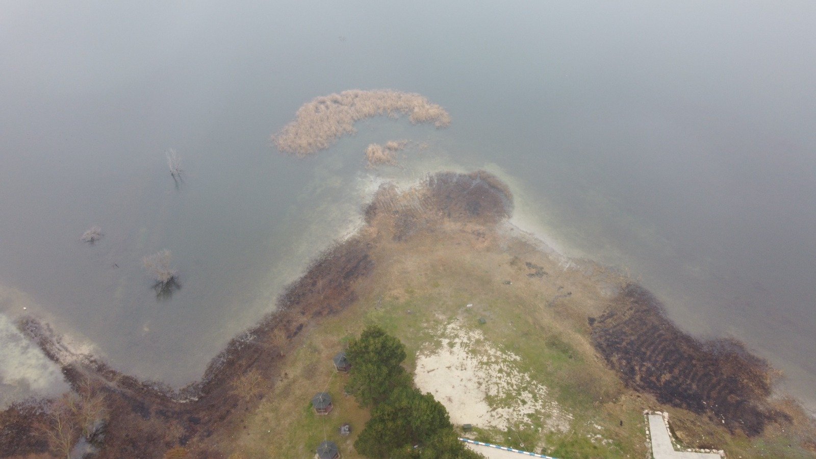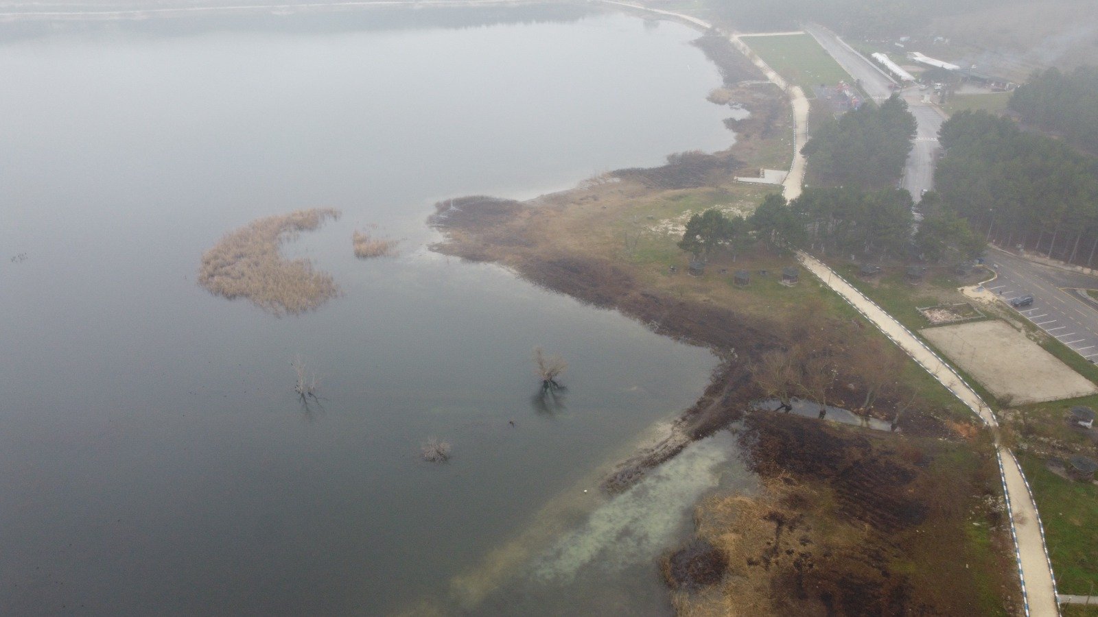 Pelitözü Göleti’nde suların kıyıdan yaklaşık 40 metre çekildiği görüldü. Gölette, kıyıdan itibaren çekilmenin en yoğun gözlendiği noktalar drone ile havadan görüntülendi.