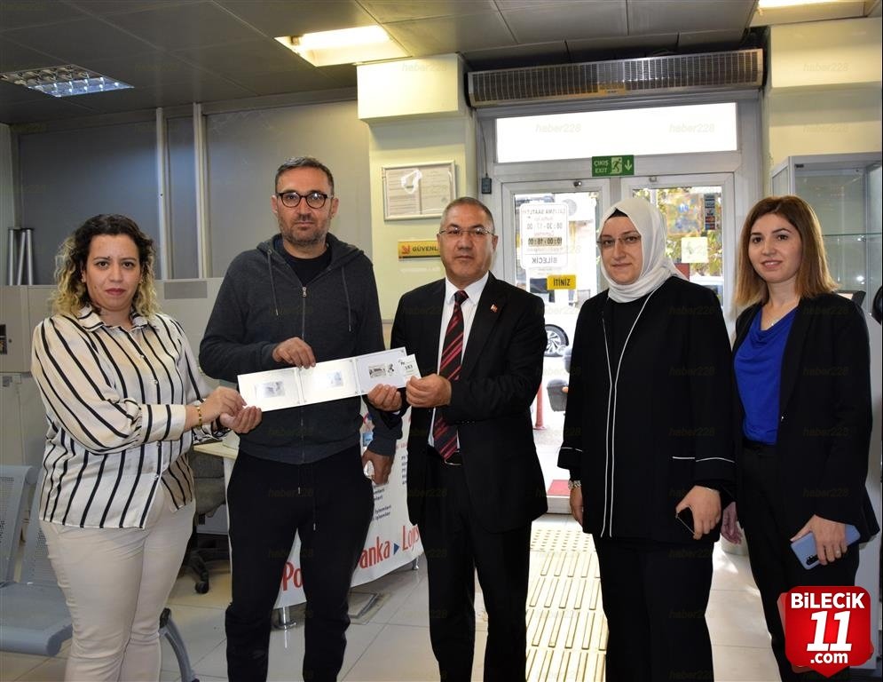 PTT Baş Müdürü Serhat Bozkurt, merkez postaneye fatura ödemesi yapmaya gelen 183 sıra numarası alan Vedat Aktaş’a kuruluş yıl dönümü için özel hazırlanan pul albümü ile yıl boyunca özverili ve başarılı performans gösteren posta dağıtıcısı Mahmut Turan’a plaket verdi.