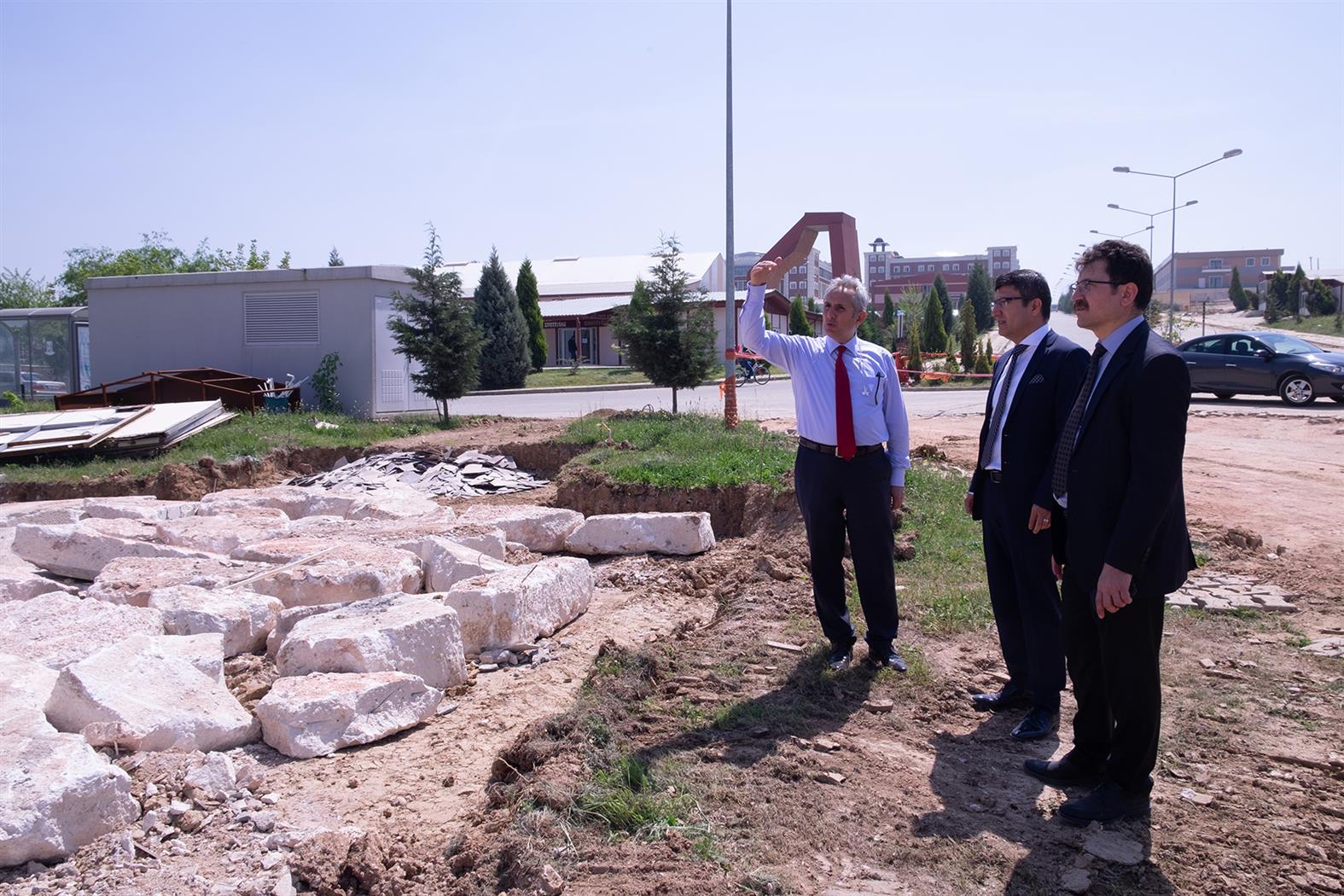İncelemelerine H Blok inşaatından başlayan Rektör Taş, temel ve çevre kazı çalışmaları %95 oranında tamamlanan inşaat hakkında mühendislerden bilgi aldı. Yaklaşık 58 milyon TL’lik bedeliyle Üniversitenin şimdiye kadar tek seferde gerçekleştirdiği en büyük ihale olma özelliği taşıyan H Blok’ta, çalışmaların programa uygun şekilde devam ettiğini belirten İlbay Vurdular, binanın zamanında tamamlanması için günde çift vardiya usulüyle çalışıldığını kaydetti. Burada, H Blok’un yanına yapılacak Merkezi Araştırma Laboratuvarı binasıyla ilgili de inceleme yapan Rektör Taş, 10.04.2018 tarihinde yapılan yer tesliminin ardından bina ve çevre perdelerinin köşe kazıklarının çakıldığı, kazı çalışmalarının da en kısa sürede başlayacağı bilgisini aldı.