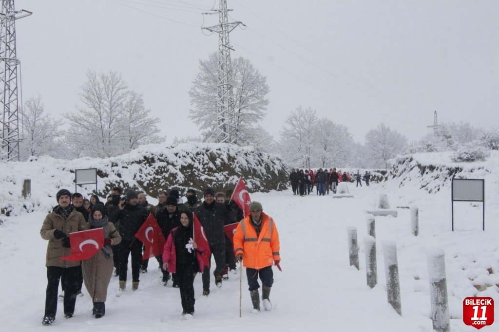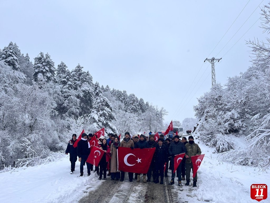 Kahvaltıdan sonra başlayan yürüyüş, “Kahrolsun PKK“, “Şehitler ölmez vatan bölünmez” sloganları ile kar yağışı altında Dereköy barajına kadar devam etti.