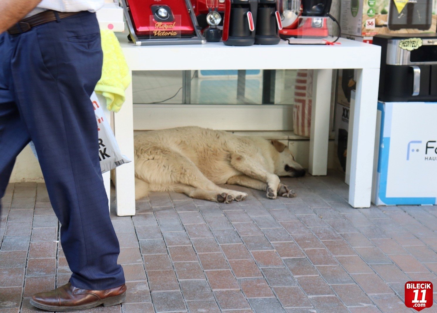 Hava sıcaklarının mevsim normallerinin birkaç derece üzerinde seyrettiği Eskişehir’de vatandaşlar kadar hayvanlar da sıcaktan bunalıyor. Odunpazarı ilçesine bağlı Hamamyolu Caddesi’nde gün içindeki yüksek sıcaktan korunmak isteyen bir sokak köpeğinin mağazanın önünde bulunan masanın altına yattığı görüldü. Köpeğin insan yoğunluğunun olduğu caddede masanın altına girerek uyuması güzel görüntülerin oluşmasına vesile olurken, çevreden geçen bazı vatandaşlar, “Sıcaktan ve insan gürültüsünden yorulduğu için oraya yatıyor galiba. Tam gölgelik yer. İnsanlar gibi onlar da sıcaktan yoruluyorlar, dinleniyorlar” yorumlarını yaptılar. – İHA