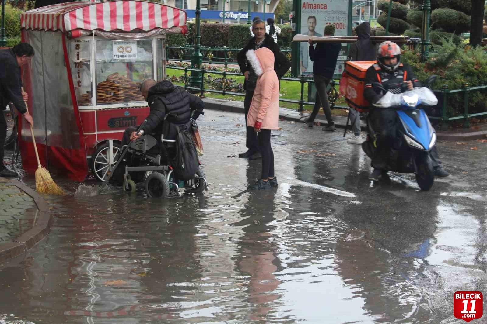 Eskişehir’de bugün sabah saatlerinden itibaren yağışlı ve soğuk hava etkili oluyor. Odunpazarı ilçesi İstiklal mahallesi Santral sokak ile Porsuk Bulvarı Tema Vakfı sokağın birleşimindeki noktada yağıştan dolayı yoğun su birikintisi meydana geldi. Oluşan su birikintisinin içinde bir simit arabasının kalması dikkat çekti. Çevredeki bazı vatandaşlar ellerine süpürge alarak suları temizlemeye çalıştığı görülürken, engelli aracında olan başka bir kişinin de yağmur sebebiyle tıkanan rögarı sopayla açma çabası göze çarptı.