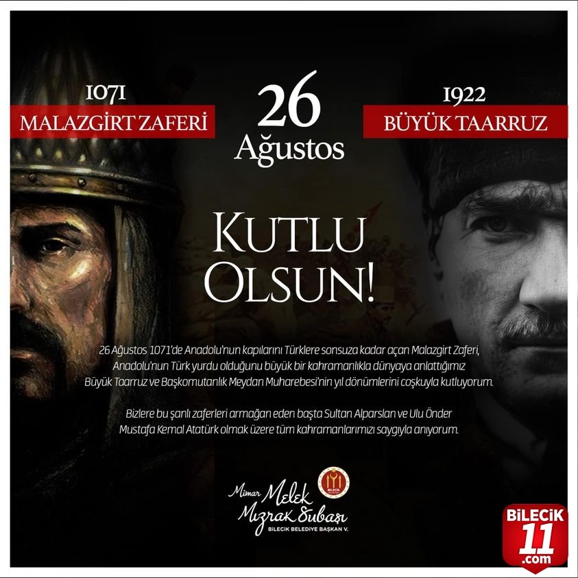 Bilecik Beldiye Başkan Vekili Melek Mızrak Subaşı Malazgirt Zaferi ve Büyük Taarruz Başkomutanlık Meydan Maharebesinin yıl dönümü nedeniyle bir mesaj yayımladı.