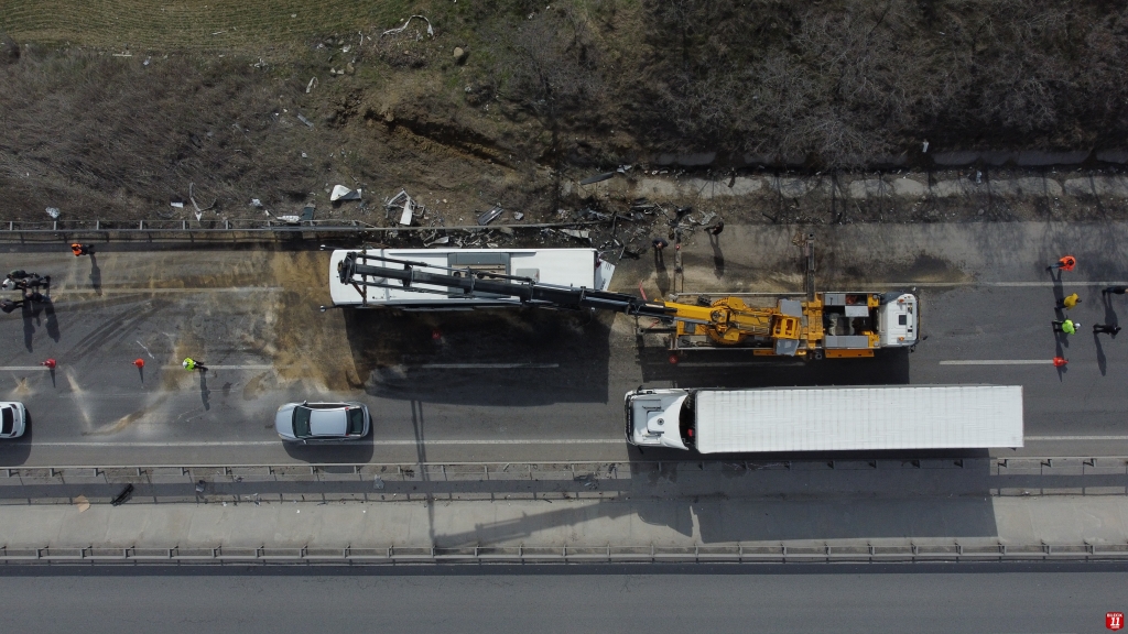 Çarpmanın etkisiyle yoldan çıkarak durabilen otobüsteki 10 yolcu ile tır şoförü F.Ö. yaralanmıştı.