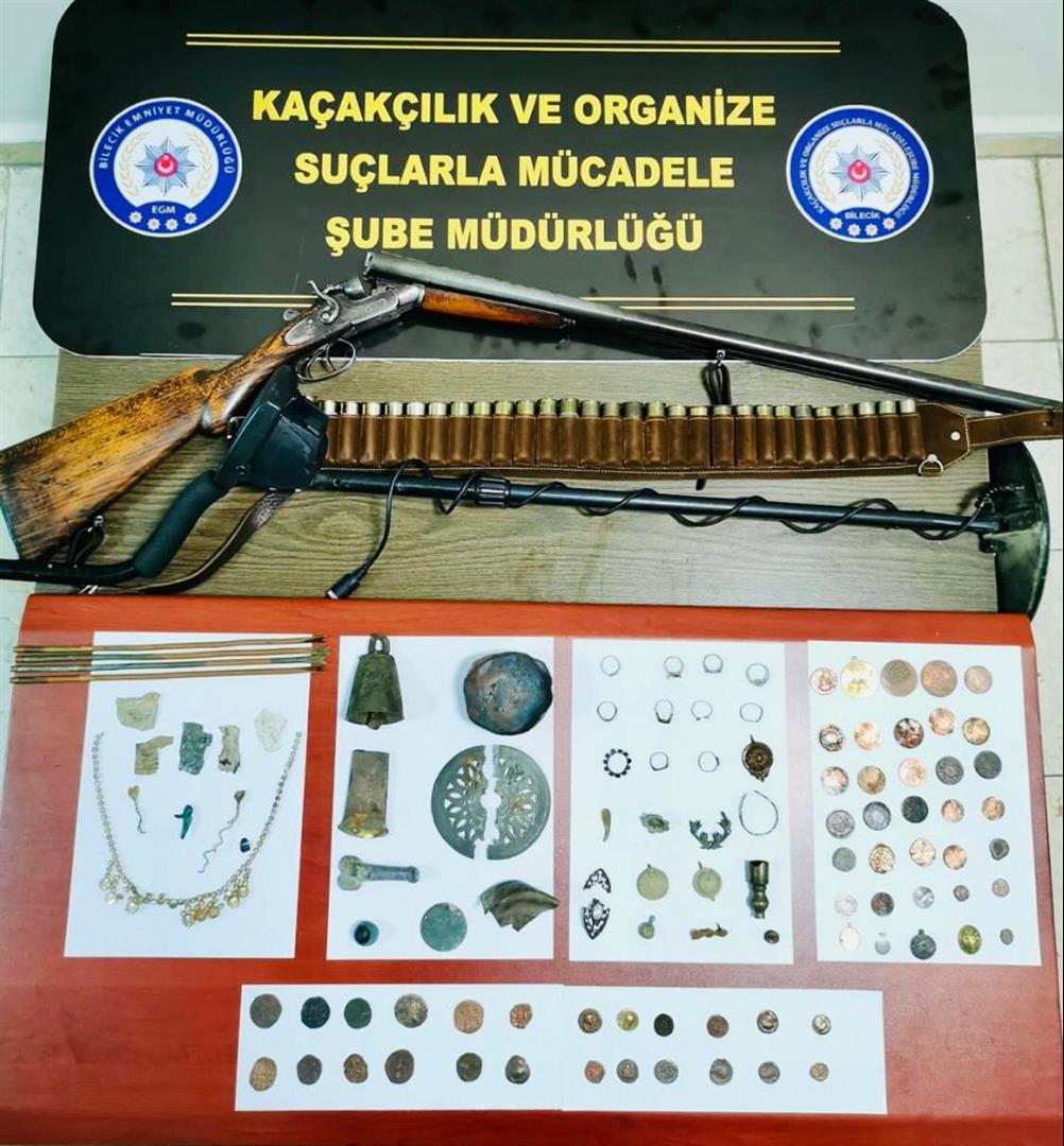 Edinilen bilgiye göre, Bilecik’te M.A. (52) isimli şahsın aracında ve ikametinde yapılan aramalarda Roma, Bizans, Selçuklu ve Osmanlı dönemlerine ait olan 55 adet farklı desen ve motife sikke, 47 adet tarihi eser niteliği taşıdığı değerlendirilen metal süs eşyası ve takı, 1 adet dedektör, 4 adet define aramakta kullanılan metal çubuk, 1 adet av tüfeği ve 29 adet fişek ele geçirildi.