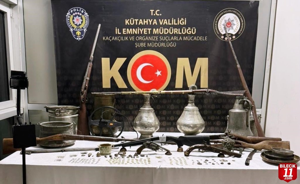 Kütahya’da polis ekipleri tarafından şüphe üzerine durdurulan araçta ve sürücüsünün evinde yapılan aramada, tarihi eser olduğu değerlendirilen 95 adet obje, 176 adet sikke, ayrıca 7 adet tüfek ve 2 adet tabanca ele geçirildi.