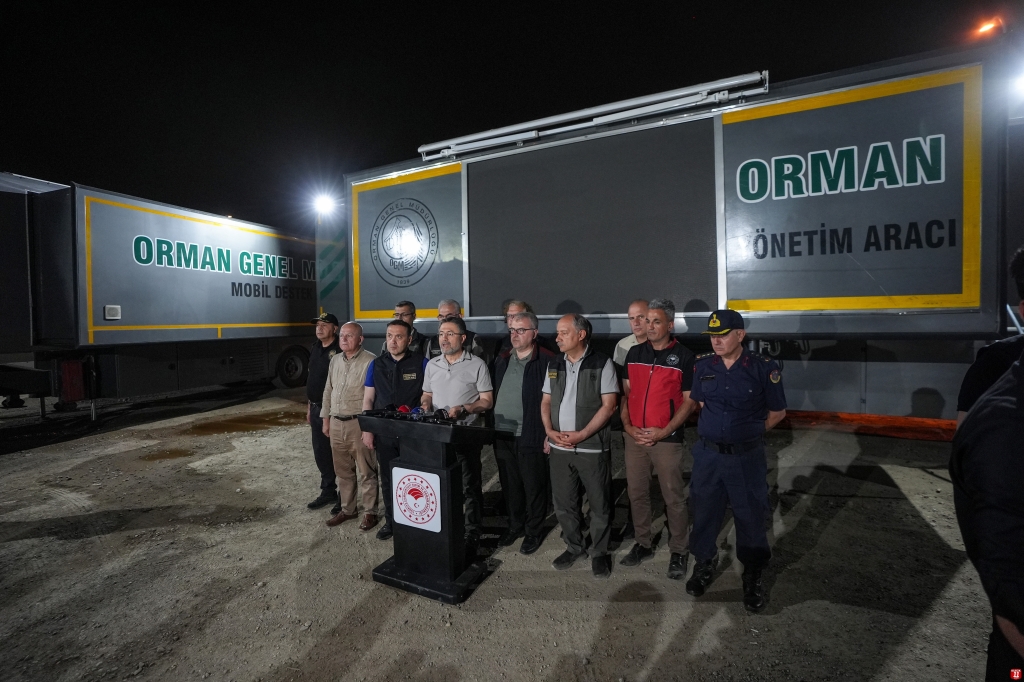 “Gece gündüz demeden, mesai mefhumu gözetmeden şu anda Sakarya Geyve’de başlayıp Bilecik Osmaneli’nde devam eden yangın için bu 53 saatin içinde sadece 45 dakika uyuyan bütün arkadaşlarımı canıgönülden tebrik ediyorum, hepsini kucaklıyorum bu fedakarlıkları için. Bugün burada birçok ekibimiz, rüzgarın aniden yön değiştirmesiyle alevlerin içerisinde kaldı, 4 arkadaşımız dumanlardan etkilendi. Çok şükür, kendilerinde herhangi bir şey yok. Eskişehir ile ilgili rapor almak için kendisini aradığımız Eskişehir Orman Bölge Müdürümüz, tam benimle telefonda konuşurken rüzgarın yine ters esmesiyle ateşlerin içerisinde kaldı 7-8 arkadaşıyla birlikte. Hemen telefonu kapattı, hamdolsun herhangi bir hasar olmadan çıktı ancak onlar da dumandan etkilendiler. Kısa bir tedaviyle tekrar işlerinin başına döndüler.”