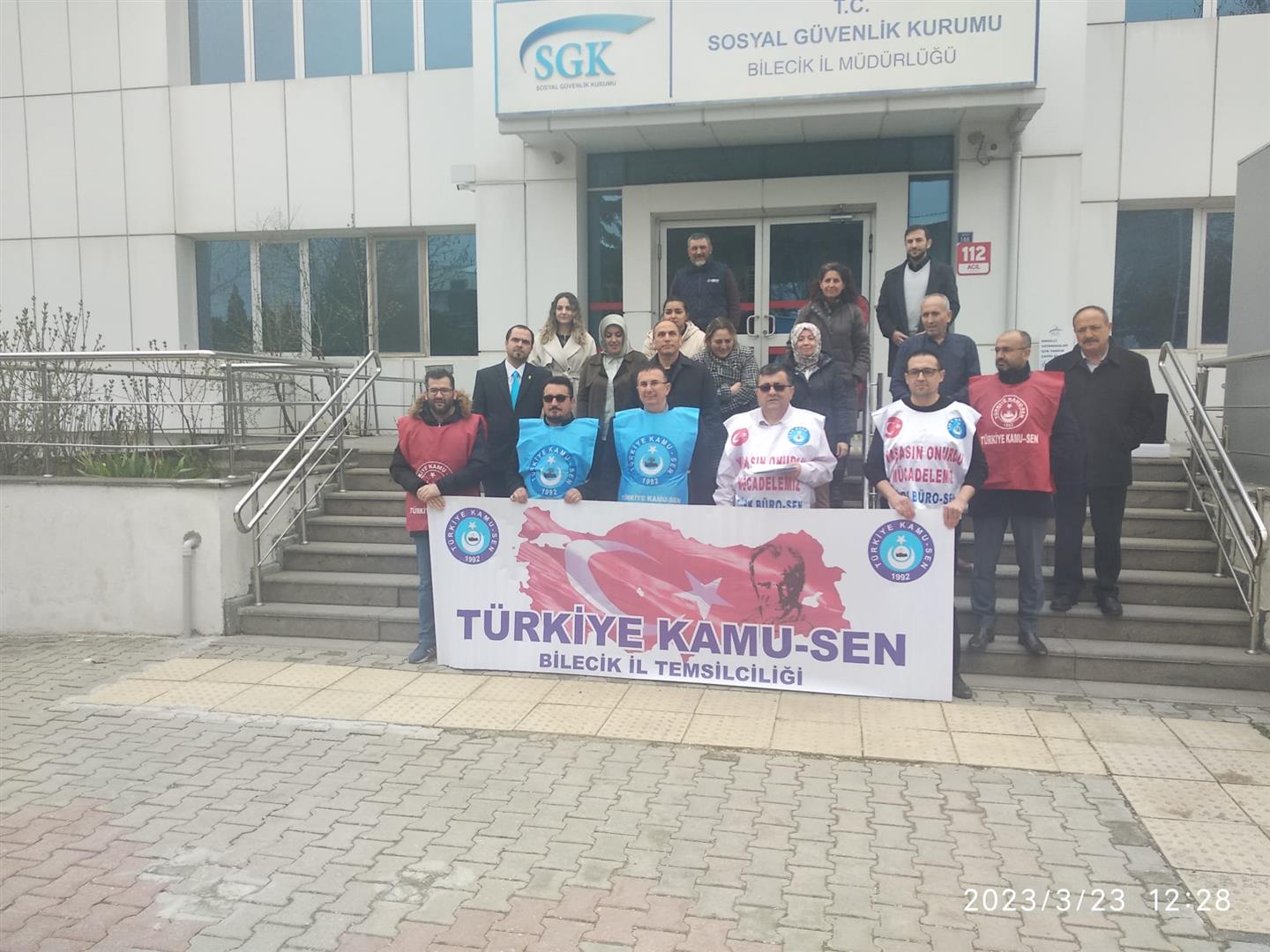 SGK çalışanlarının sıkıntılarına dikkat çekmek adına Türk Büro-Sen Genel Merkezi tarafından 81 ilde eş zamanlı olarak düzenlenen basın açıklamaları kapsamında Bilecik’te de Türk Büro-Sen İl Temsilcisi Cüneyt Taşkesen tarafından SGK İl Müdürlüğü binası önünde basın açıklaması düzenlendi.