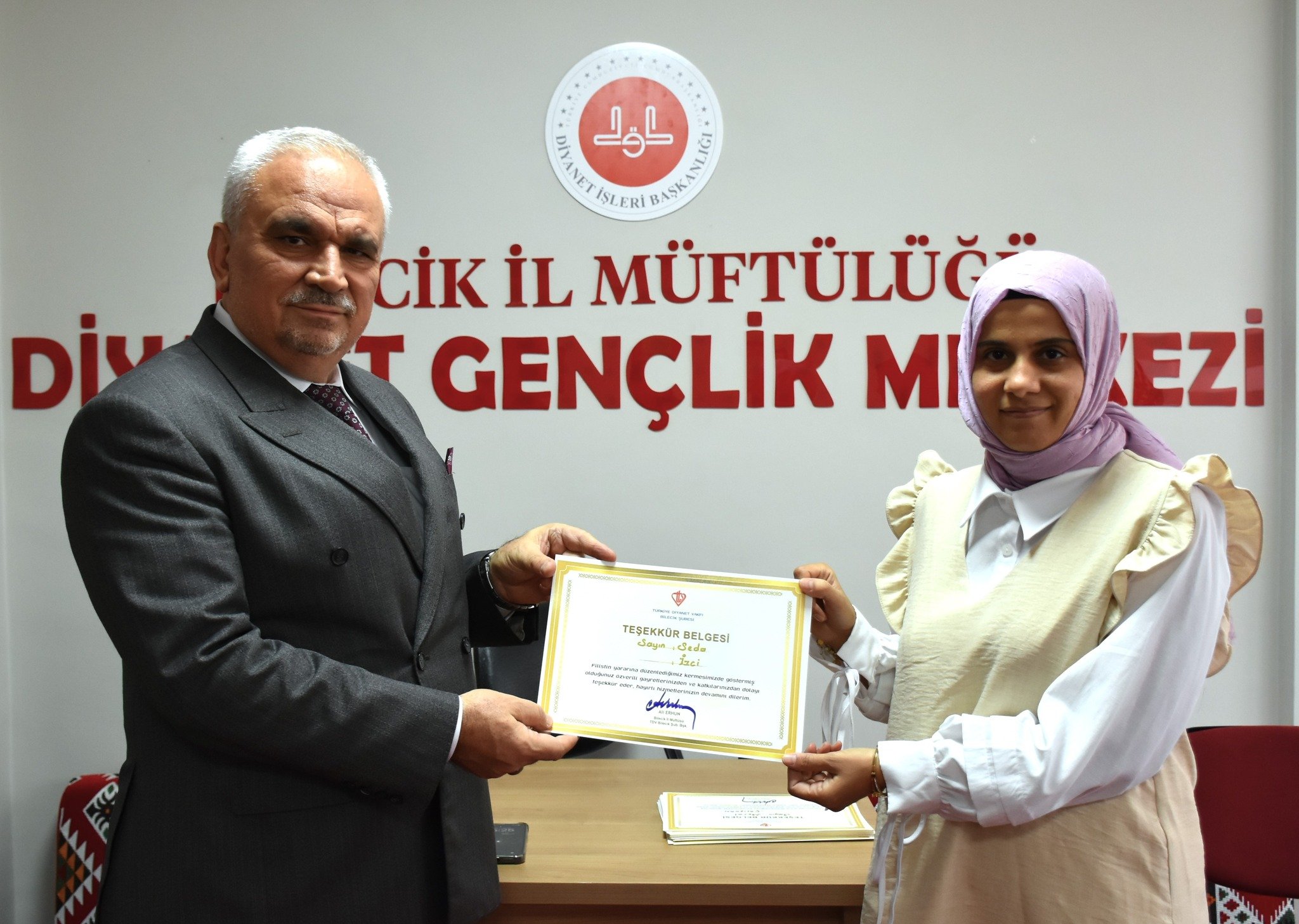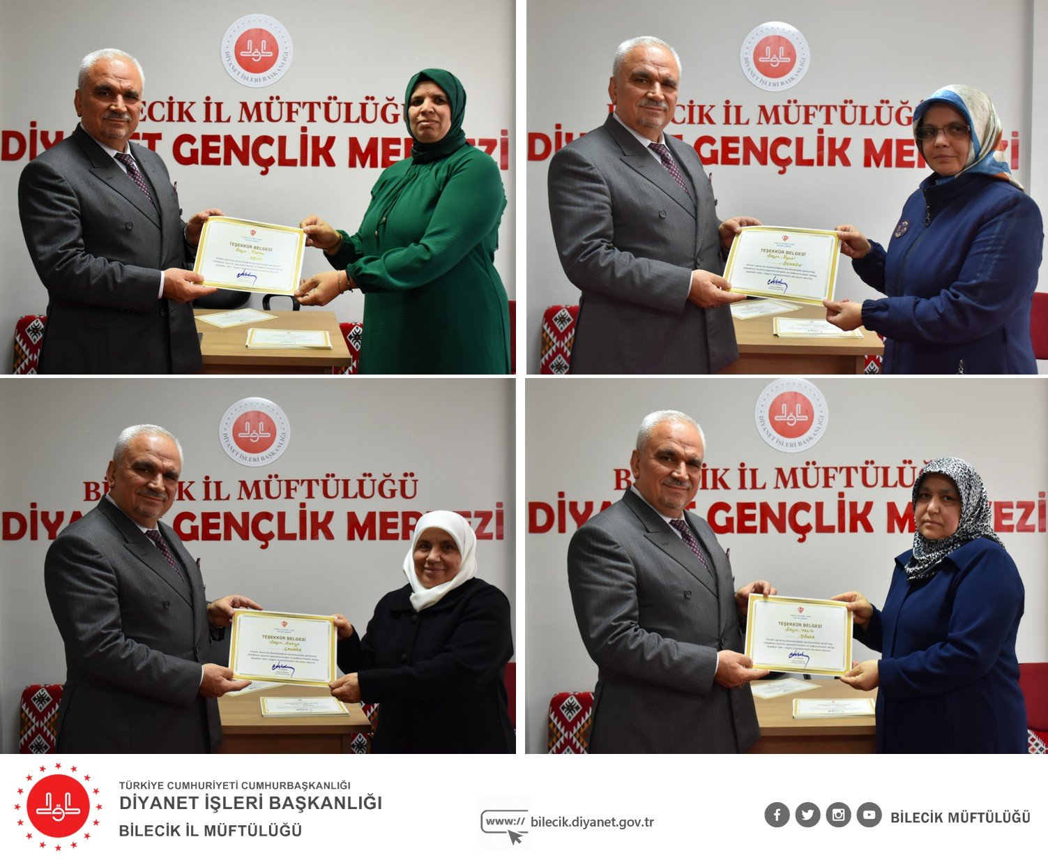 Bilecik Diyanet Gençlik Merkezinde düzenlen belge takdim programına İl Müftüsü Ali Erhun, Müftü Yardımcısı Hatice Geçgelen ve TDV Gönüllüleri katıldı.