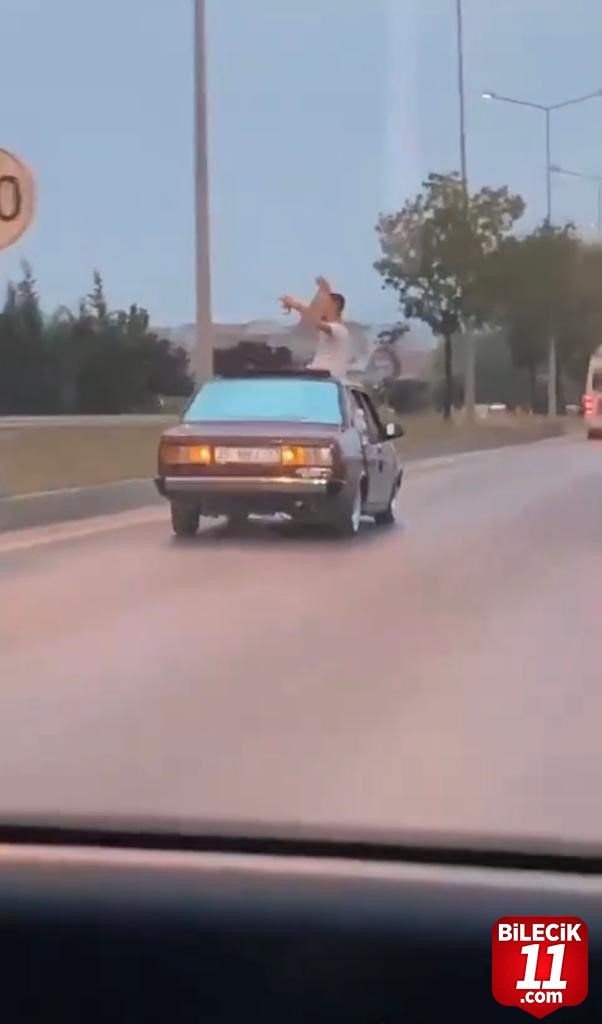 Eskişehir-Ankara kara yolu üzerinde bir vatandaş tarafından cep telefonu kamerası ile çekilen görüntüler akıllara durgunluk verdi. Çevreyolu üzerinde hızla giden otomobilin üst camından dışarı çıkan şahıs, hem kendisini hem de trafiği tehlikeye soktu. Elindeki içecek şişesiyle birlikte camdan çıkarak hızla giden otomobilin üstünde yolculuğa devam eden şahıs, görenlerden tepki topladı. – İHA