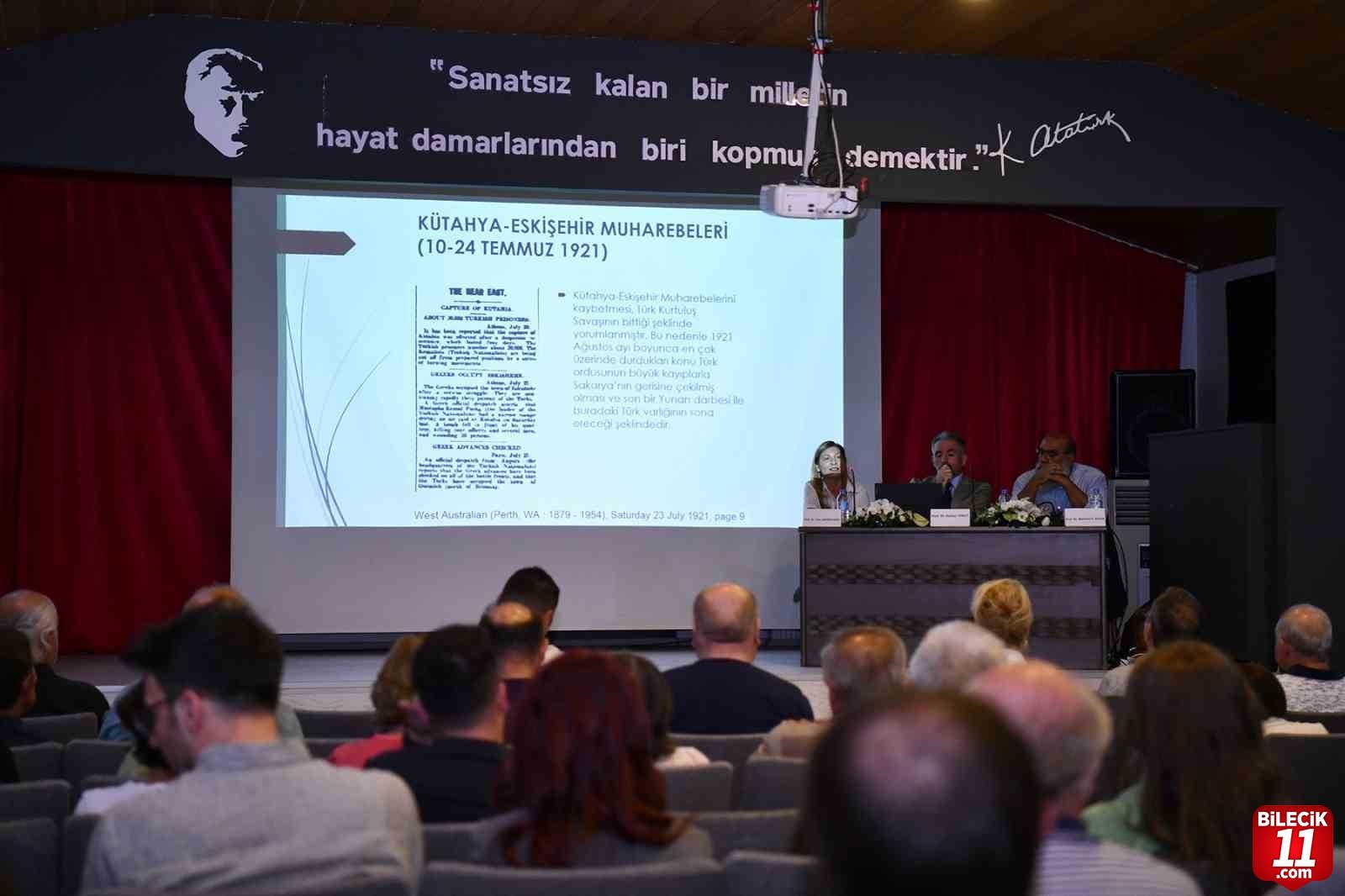 Prof. Dr. Esra Sarıkoyuncu, “Eskişehir milli mücadele döneminde çok önemli yere sahip. Öncelikle sebebi Anadolu’yu İstanbul’a ve Ankara’ya bağlayan demiryoluna sahip. Kuvayi Milliye’nin önde gelen liderleri Eskişehir üzerinden İstanbul’a, Ankara’ya veya Anadolu’nun diğer illerine geçmek durumundaydılar. Ankara’nın milli direnişin merkezi olmasından sonra Eskişehir Ankara’yı koruyan bir kale konumuna geldi. Dolayısıyla da kurtuluş savaşının en kanlı savaşı Eskişehir ve çevresinde meydana gelmiştir. 1. ve 2. İnönü Muharebeleri sadece batı cephesinin değil kurtuluş savaşı içinde dönüm noktası olmuştur. İşgalci olmaları etkisiyle İngiliz ve Avusturya basını bu savaşları dikkatle takip etmişlerdir” diyerek batı cephesinde geçen savaşların İngiliz ve Avusturya basınına nasıl yansıdığını anlattı.