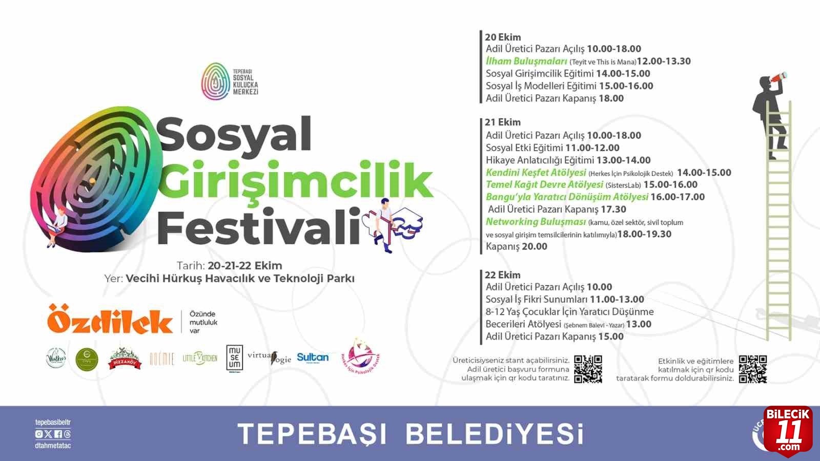 Tepebaşı Belediyesi’nin kardeş şehri Treptow-Köpenick Belediyesi iş birliğinde hayata geçirdiği Tepebaşı Sosyal Kuluçka Merkezi gerçekleştirdiği eğitim ve etkinlikler ile sosyal girişimci adayı gençlerin ufkunu genişletmeyi sürdürüyor. Bu çerçevede Eskişehir’de ilk kez gerçekleştirilecek Sosyal Girişimcilik Festivali’nde katılımcılara yönelik eğitimler, atölyeler ve etkinlikler düzenlenecek. Sosyal girişimlerin görünürlüklerini artırmak, sosyal girişimler için alternatif pazar yerleri oluşturmak, sosyal girişimlerin birbirleriyle iş birliği geliştirebilecekleri alanlar sağlamak gibi amaçlarla düzenlenecek festivalde, farklı sektörlerden adil ticaret modelini uygulayan 24 sosyal girişim, stantlarında ürün satışlarını ve tanıtımlarını gerçekleştirilecek. Ürün satışlarının yanı sıra sosyal girişimciler ve Tepebaşı Sosyal Kuluçka Merkezi tarafından eğitimler, atölyeler, ilham buluşmaları ve networking buluşması düzenlenecek.