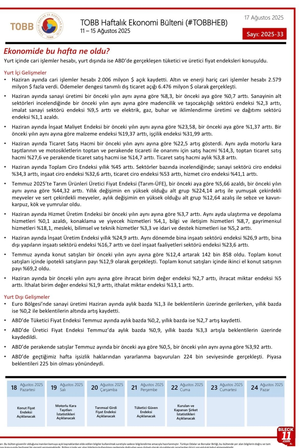 Türkiye Odalar ve Borsalar Birliği (TOBB), 11-15 Ağustos tarihleri arasında Türkiye ve dünya ekonomisinde yaşanan güncel gelişmeleri içeren Haftalık Ekonomi Bülteni’ni yayımladı.