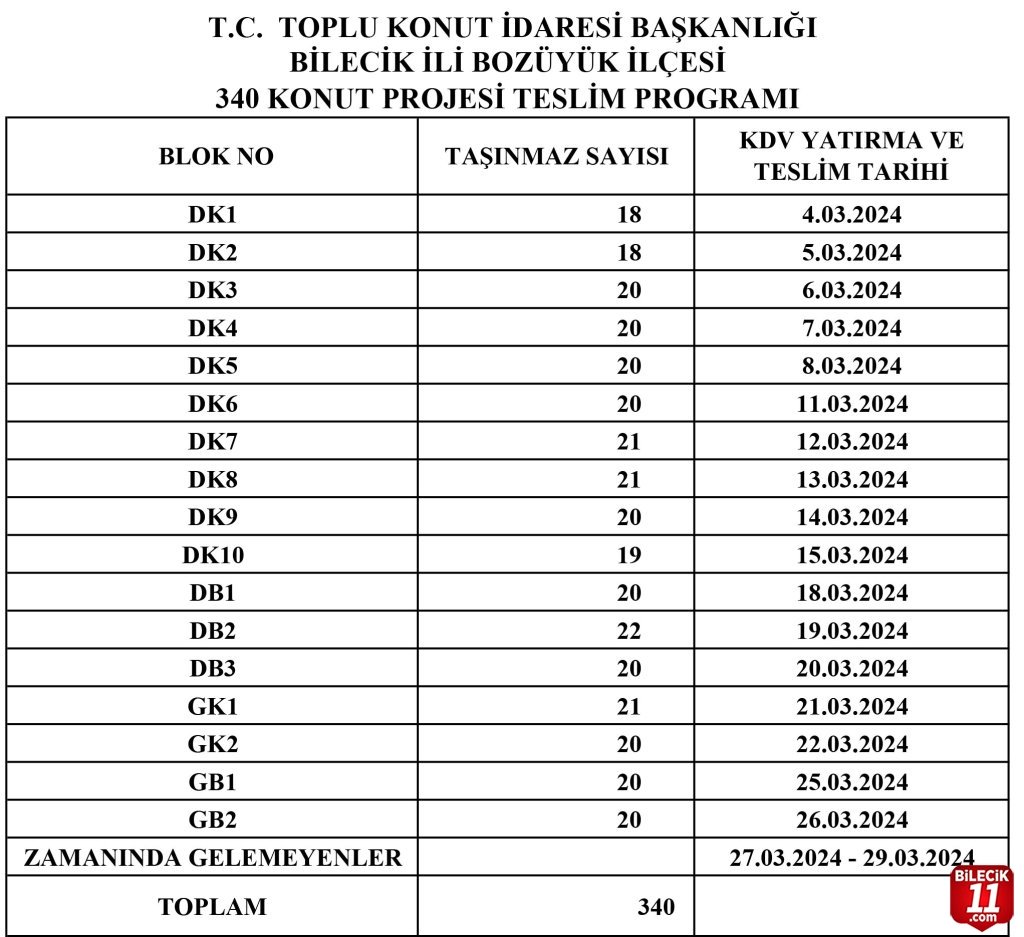 4 Mart tarihinde başlayan 340 Adet Konutun teslimatının tamamlanması 29 Mart tarihine kadar sürecek.