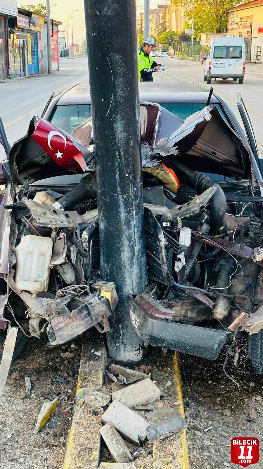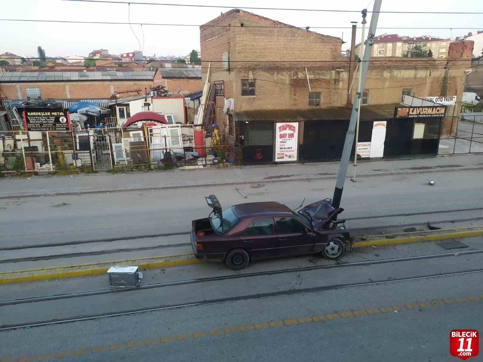 Araç, tramvay hattı üzerinde bulunan kataner direğine çarptı.