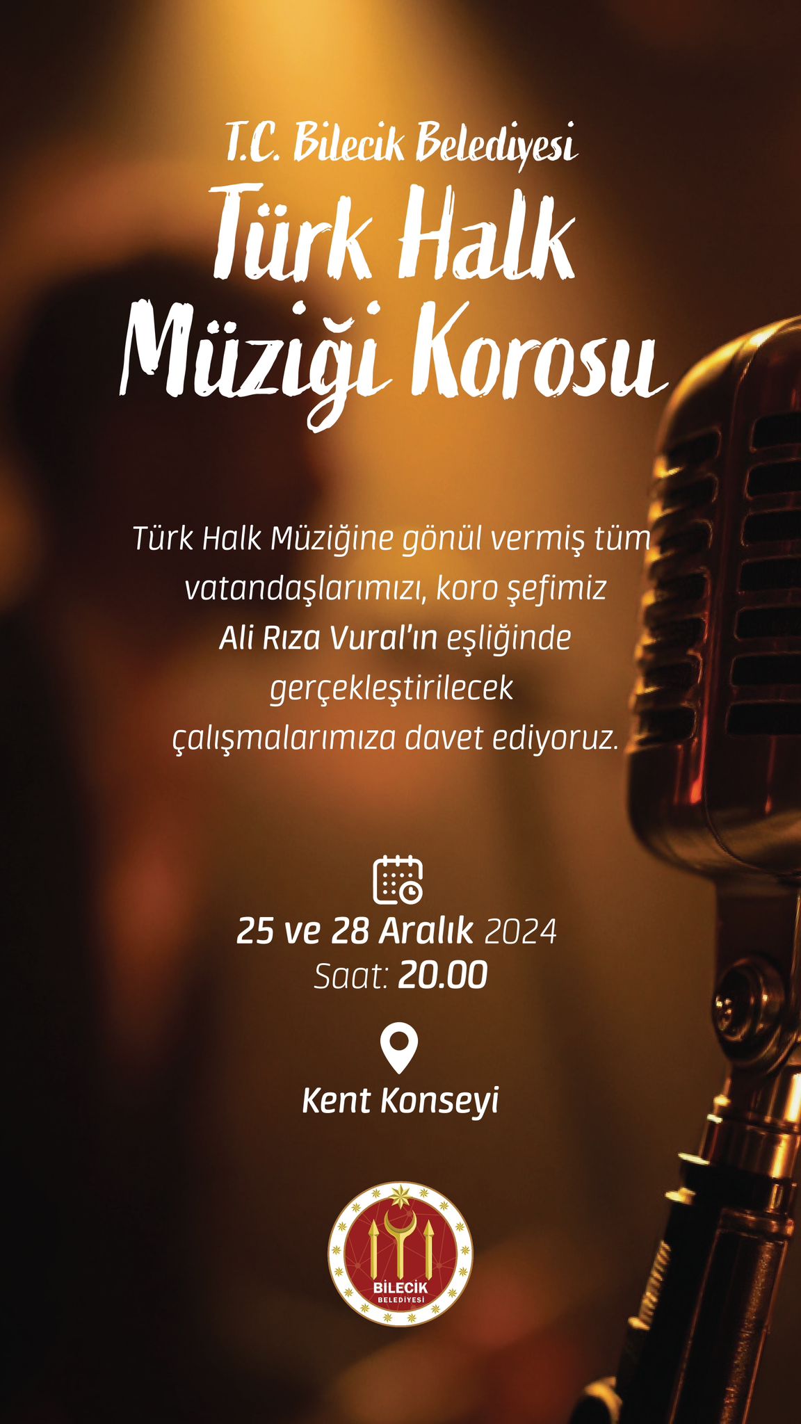 Bilecik Belediyesi öncülüğünde gerçekleştirilecek olan Türk Halk Müziği korosu için çalışmalar, 25 Aralık Çarşamba günü başlıyor.