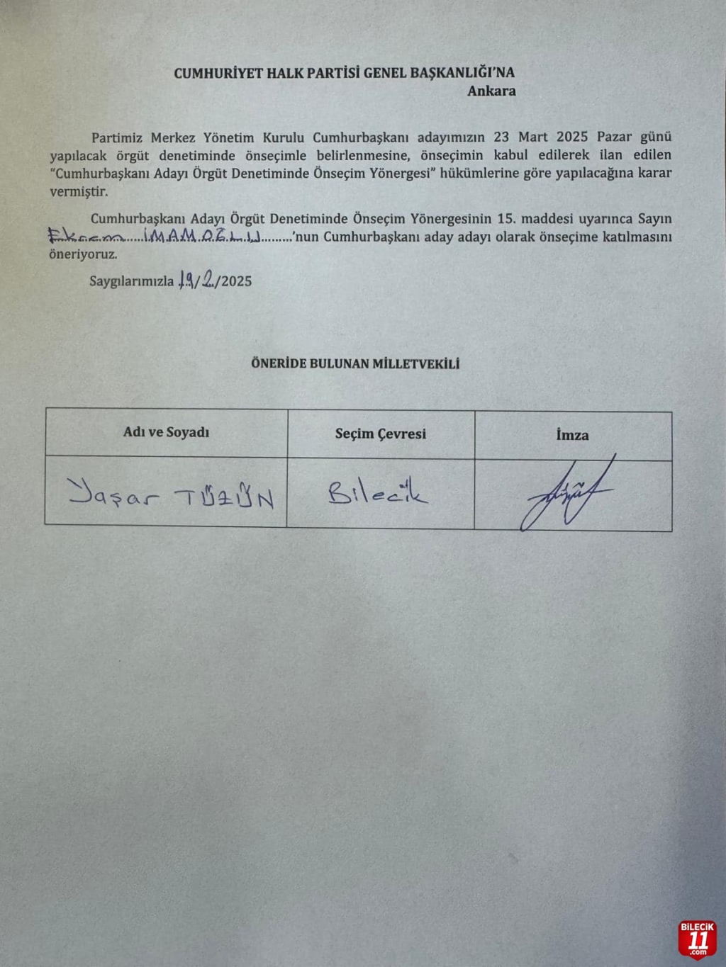 23 Mart 2025 Pazar günü yapılacak Cumhurbaşkanı adaylığı ön seçimi için, CHP Yerel Yönetimler Başkan Yardımcısı, Bilecik Milletvekili Yaşar Tüzün, İstanbul Büyükşehir Belediye Başkanı Ekrem İmamoğlu’nu aday göstermek için imza verdi.