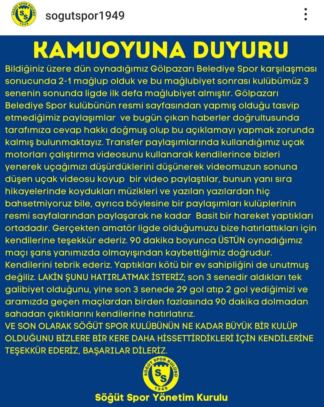 Gölpazarı Belediye Spor kulübünün resmi sayfasından yapmış olduğu tasvip etmediğimiz paylaşımlar ve bugün çıkan haberler doğrultusunda tarafımıza cevap hakki doğmuş olup bu açıklamayı yapmak zorunda kalmış bulunmaktayız. Transfer paylaşımlarında küllendiğimiz uçak motorları çalıştırma videosunu kullanarak kendilerince bizleri yenerek uçağımızı düşürdüklerini düşünerek videomuzun sonuna düsen uçak videosu koyup bir video paylaştılar, bunun yani sıra hikayelerinde koydukları müzikleri ve yazılan yazılardan hiç bahsetmiyoruz bile, ayrıca böylesine bir paylaşımlar kulüplerinin resmi sayfalarından paylaşarak ne kadar basit bir hareket yaptıkları ortadadır. Gerçekten amatör ligde olduğumuzu bize hatırlattıkları için kendilerine teşekkür ederiz. 90 dakika boyunca üstün oynadığımız maçı şans yanımızda olmayışından kaybettiğimiz doğrudur. Kendilerini tebrik ederiz. Yaptıkları kötü bir ev sahipliğini de unutmuş değiliz.