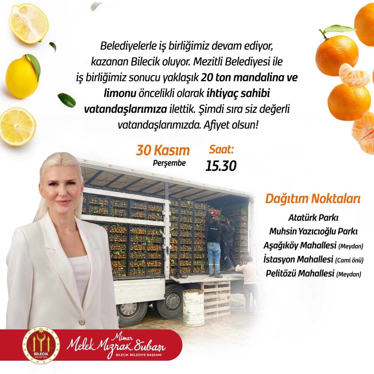 “Belediyelerle iş birliğimiz devam ediyor, kazanan Bilecik oluyor. Mezitli Belediyesi ile iş birliğimiz sonucu yaklaşık 20 ton mandalina ve limonu öncelikli olarak ihtiyaç sahibi vatandaşlarımıza ilettik. Şimdi sıra siz değerli vatandaşlarımızda. Afiyet olsun. 30 Kasım Perşembe 15.30 Atatürk Parkı Muhsin Yazıcıoğlu Parkı Aşağıköy Mahallesi (Meydan) İstasyon Mahallesi (Cami önü) Pelitözü Mahallesi (Meydan)” dedi.