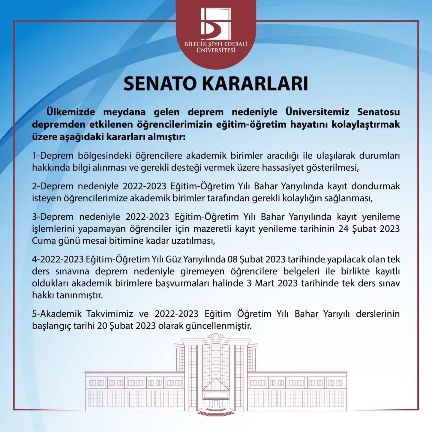 ”Ülkemizde meydana gelen deprem nedeniyle Üniversitemiz Senatosu depremden etkilenen öğrencilerimizin eğitim-öğretim hayatını kolaylaştırmak üzere aşağıdaki kararları almıştır: