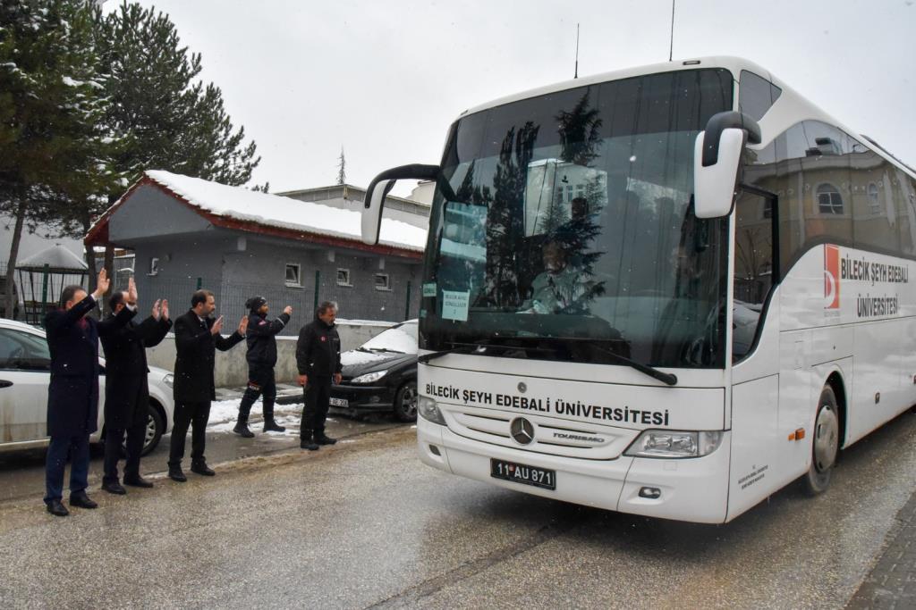 Bilecik Valisi Sayın Dr. Kemal Kızılkaya, Rektör Prof. Dr. Şükrü Beydemir ve vatandaşların yolcu ettiği AFAD gönüllülerini taşıyan konvoya üniversite de bir otobüsle lojistik destek verdi.