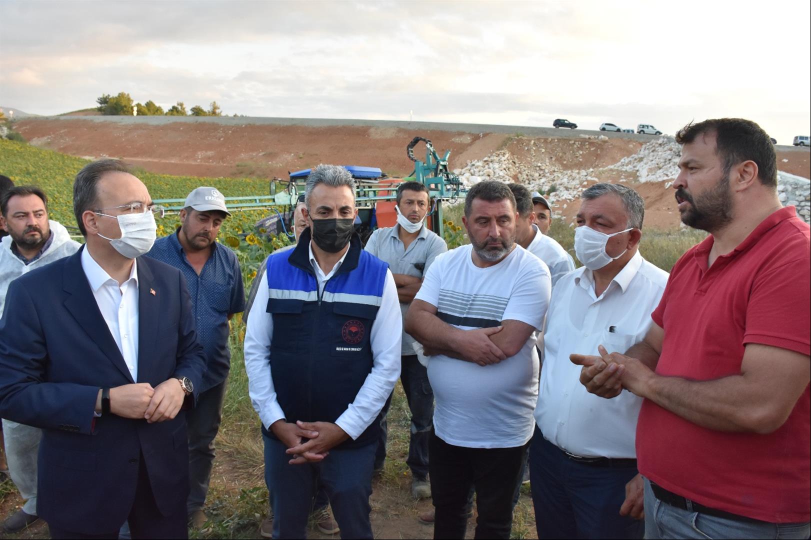 Şehirde etkili olan çayır tırtılı zararlısıyla ilgili incelemede bulunmak üzere merkeze bağlı Taşçılar köyüne gelen Vali Kızılkaya, bir ayçiçeği tarlasında üreticilerle görüştü.