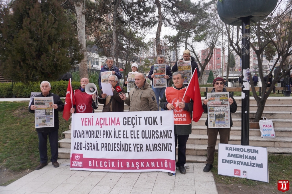 Vatan Partisi Bilecik İl Örgütü Üyeleri, MHP Genel Başkanı Devlet Bahçeli’nin terör örgütü PKK lideri Abdullah Öcalan çağrısı ve İmralı görüşmelerine dair basın açıklaması yaptı. Vatan Partisi Bilecik İl Başkan Yardımcısı Feyzi Köse, “İkinci açılıma hayır! İkinci İsrail yani Kürdistan’a hayır! Türk de biziz Kürt de biziz. Hepimiz Türk Milletiyiz! Kahrolsun PKK!” dedi.