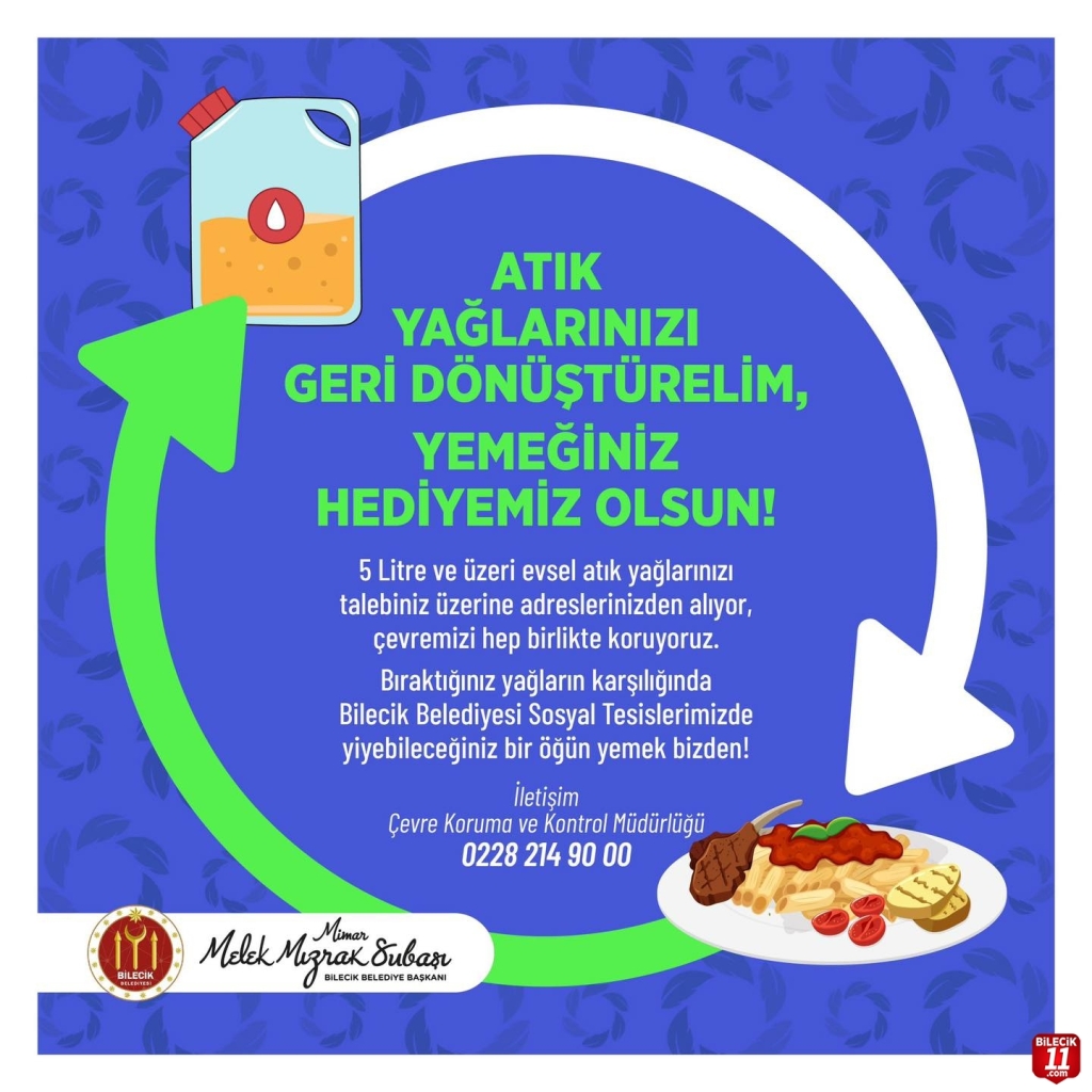 5 Litre ve üzeri evsel atık yağlarınızı talebiniz üzerine adreslerinizden alıyor, çevremizi hep birlikte koruyoruz. Bıraktığınız yağların karşılığında Bilecik Belediyesi Sosyal Tesislerimizde yiyebileceğiniz bir öğün yemek bizden!”