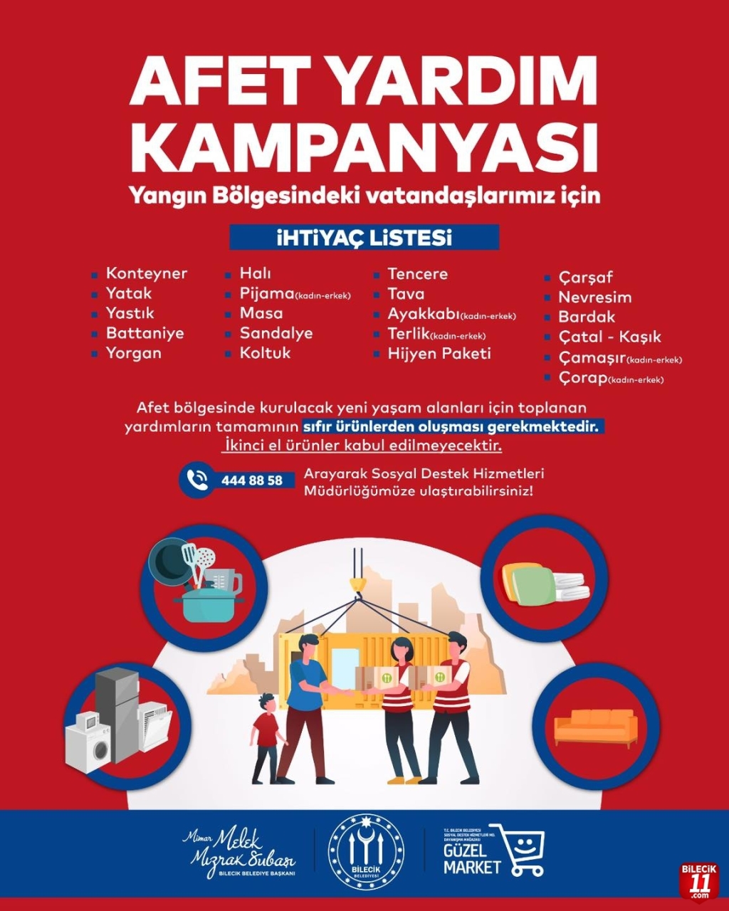 Geçtiğimiz günlerde Bilecik’in Gölpazarı ve Osmaneli ilçelerinde meydana gelen yangın felaketi sonrasında Bilecik Belediyesi tarafından yardım kampanyası başlatıldı.